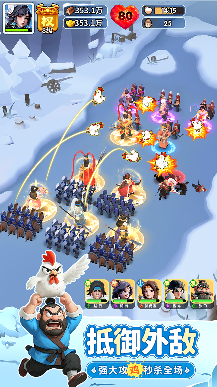 招募三国武将,诸葛亮,赵云,吕布听您调遣,使用不同武将组合守卫城市。