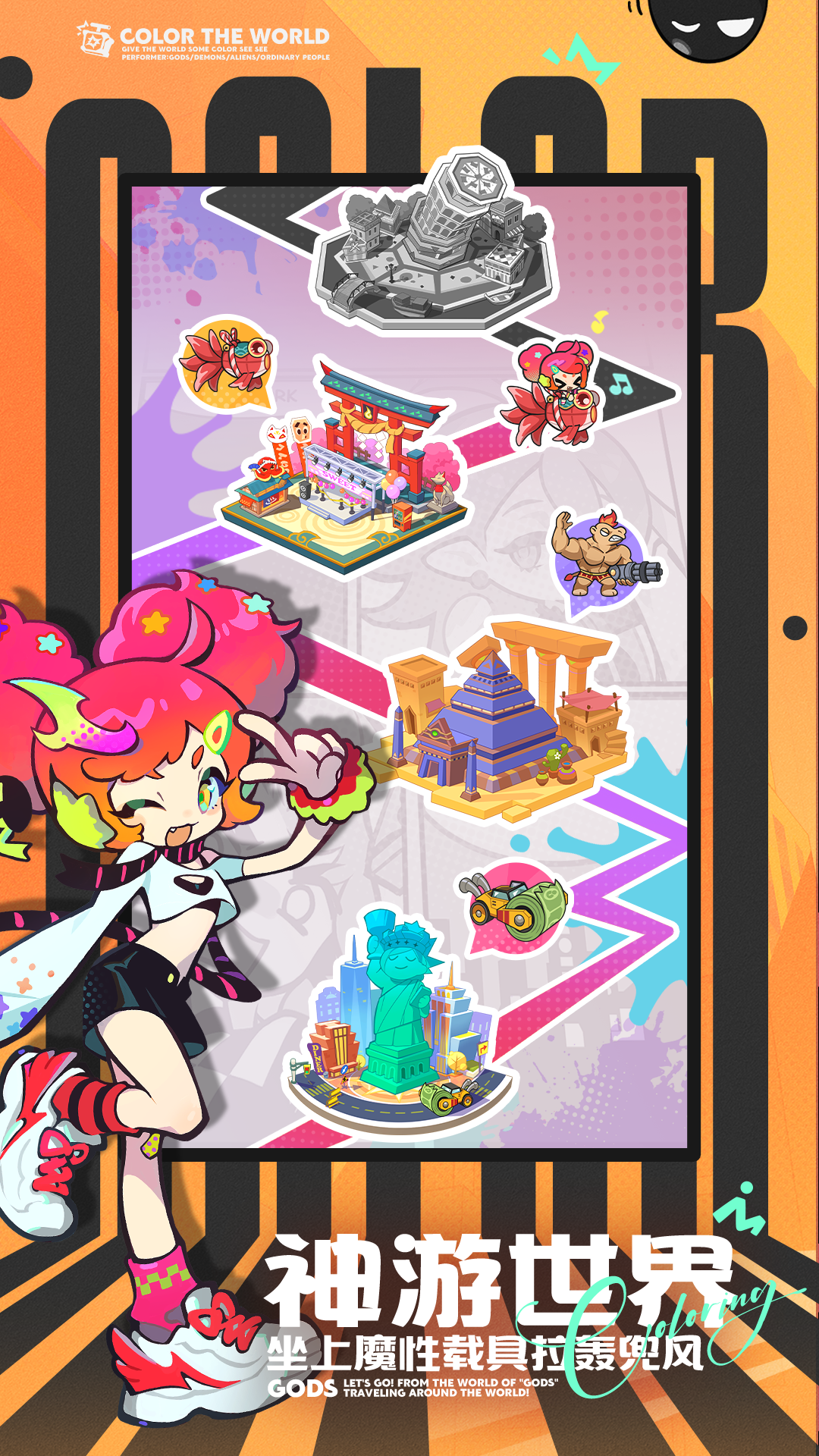 《乱涂!彩世界》是一款潮酷无厘头的放肆染色逛gai“神”游,在这里你可以体验: