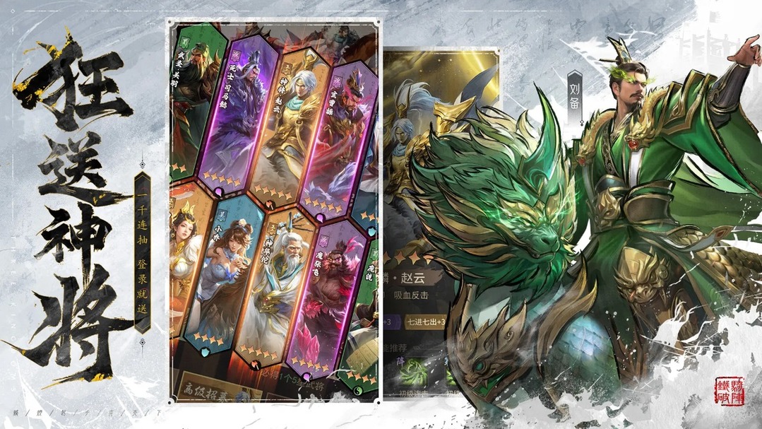 新手十连抽必出强将,登录送 SSR 神将与全套养成资源,升级领海量元宝材料,零氪也能轻松组建豪华阵容。