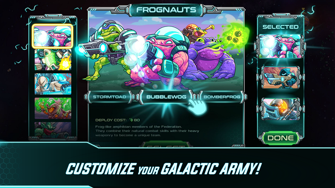 训练勇敢的英雄及其技能:增强军队的火力、提升他们的耐力和攻击范围,或在敌人进攻前侦测到他们。带领他们捍卫银河系的和平!