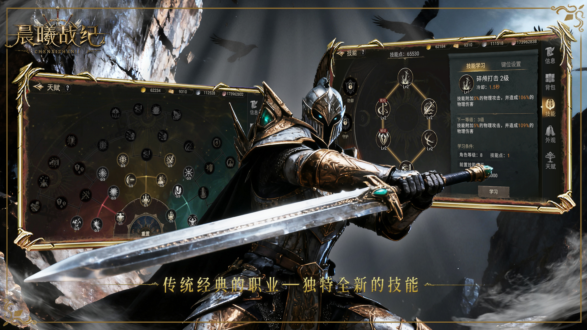《晨曦战纪》是一款暗黑风格的MMO动作冒险手游,带你踏入一个充满神秘与挑战的奇幻世界。游戏中有三大职业、九大流派选择,你可以召唤魂侍,勇探深渊遗迹,寻找失落的宝藏;亲手铸造专属神兵,打造独一无二的战力;协助城主运输物资,经营壮大自己的势力;更可集结战友,直面灾厄级BOSS,开启热血激斗。在这里,每一步都是传奇,每一战皆成史诗——谱写属于你的英雄之歌!