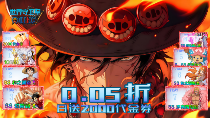 世界守卫军(0.05折日送2000代金券)是一款正版横版海贼卡牌游戏!游戏内真实还原了路飞一路成长的历程,一路挑战各个关卡,收入各个动漫里面脍炙人口的人物作为自己的伙伴,一起征战新世界!新版百万代金版本强势来袭,首续充值0.05折,每日签到赠送2000代金券,爽玩停不下来;七天奖、新手狂欢、升级奖励、满月礼等大量福利活动,送超多充值卡、体力、抽卡等战力道具;这个海贼王卡牌手游,真的好玩!爱玩!