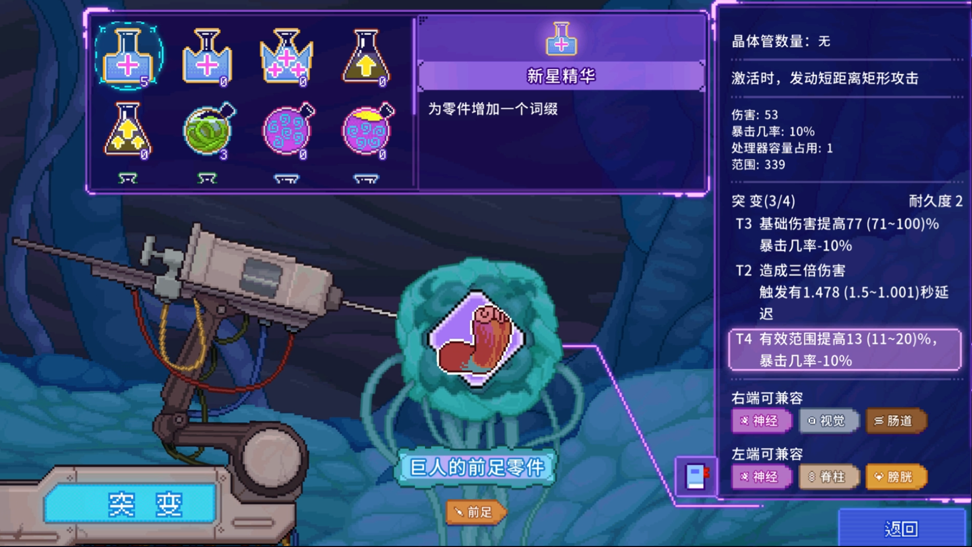 游戏中包含上百种功能各异的器官。每种器官还可以通过变异,获得额外的词缀