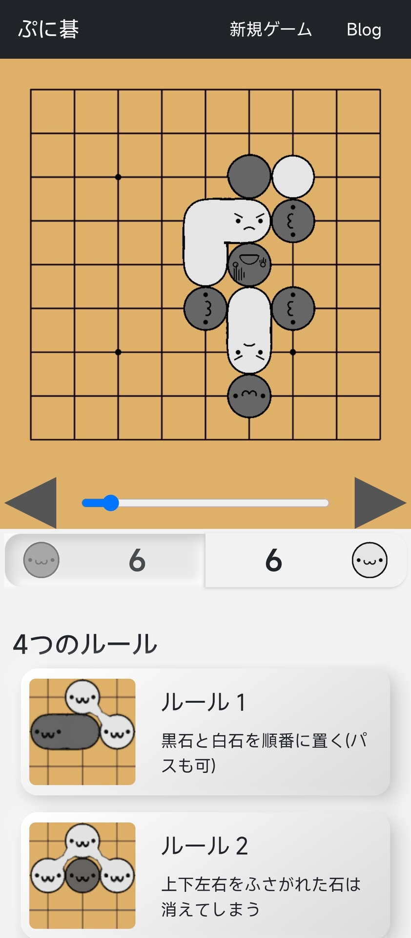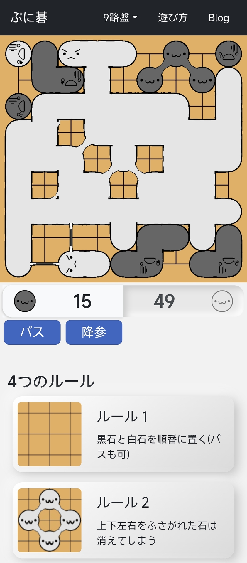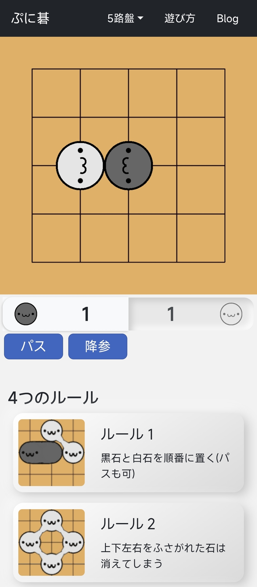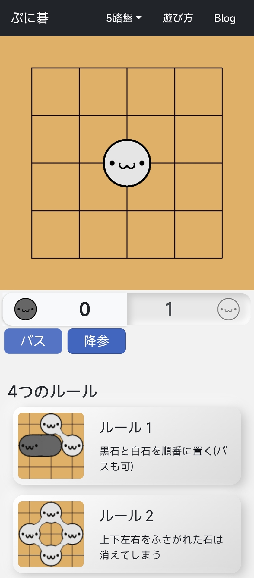 以围棋入门者为对象,以石块的连接和生死为基石的表情来简单易懂的游戏。在5路盘和7路盘这样的小盘面上,AI对手可以在短时间内进行游戏。在规则方面也比通常的围棋简化了,与纯围棋规则大致相同。