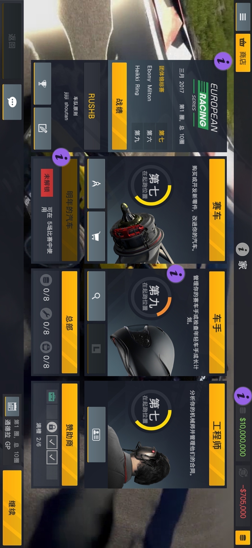 雇佣车手,研发赛车,购买零部件,参与大赛,签约赞助商……
