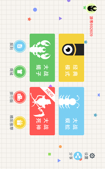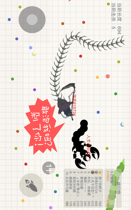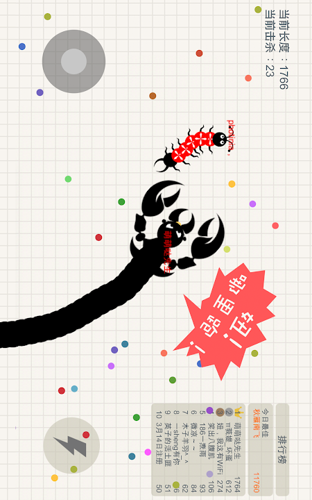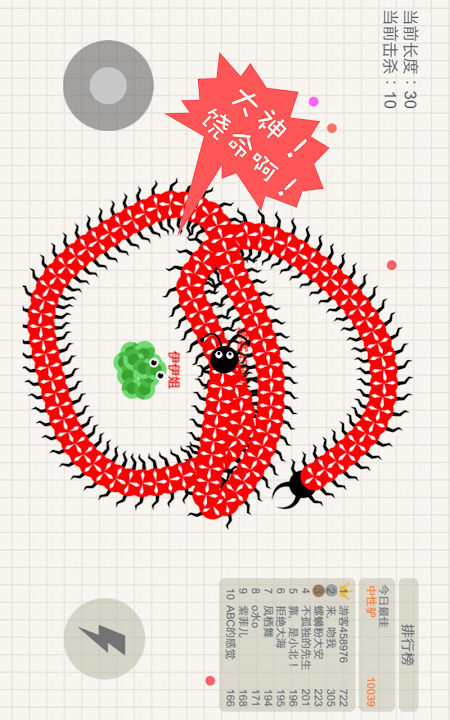 小蛇斗蜈蚣!这是一个有毒的游戏! 新增超级BOSS,死神、蝎子精、蜈蚣精闪亮登场! 这是一款超好玩的休闲竞技游戏,不仅比拼手速,更考验你的策略!在贪吃蛇大作战的世界中,每个人在初始都化身为一条小蛇,通过不断努力变得越来越长,最终制霸一方! 游戏玩法 1.控制摇杆走位你的小蛇,吃掉地图上彩色的小圆点,就会变长。 2.小心!蛇头碰到其他贪吃蛇就会死亡,并且产生大量小圆点。 3.长按加速键,用巧妙的走位让蛇身被别人撞上,就可以吃掉尸体迅速变长。 4.新增超级BOSS,蝎子精、蜈蚣精等你来挑战!