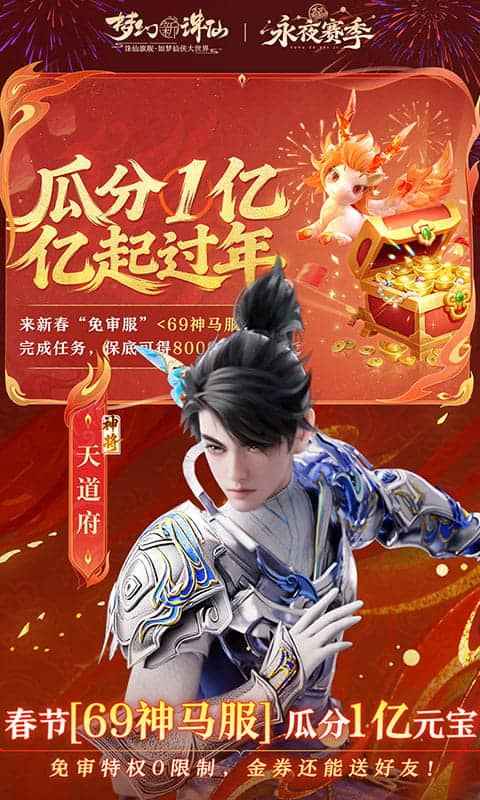 青花瓷非遗联动版本「青花铸战甲」上线!天道府全新流派「神将」出世,双流派随时随地免费切换;全新万人刮宝大服开启,热闹非凡;新赛季毒元素重磅更新,体验升级;年度非遗联动青花瓷战灵登场,大放异彩;国庆佳节狂送好礼十五天,战灵/绝品仙友/坐骑等,惊喜不断;赛季魂印/灵兽养成助力,不肝不氪无痛修仙!