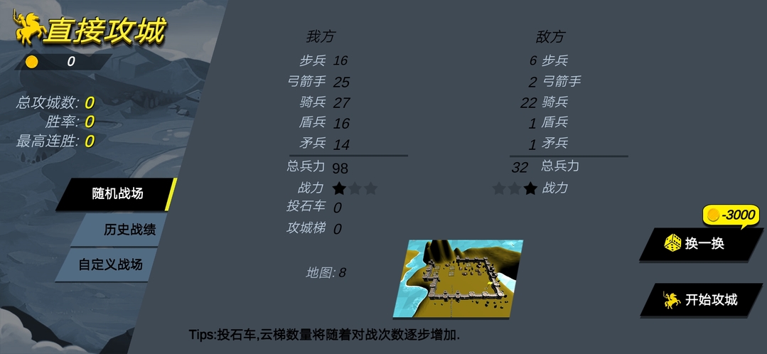 《直接攻城》是一款策略类游戏,组建强大的战斗兵团,将所有的入侵者统统的击败吧。旋转格子,规划路线,收集道路上的物资,并不断地招募士兵。不同的兵种搭配让你的队伍更加强大,用最完美的阵容去征服对方的城池吧。