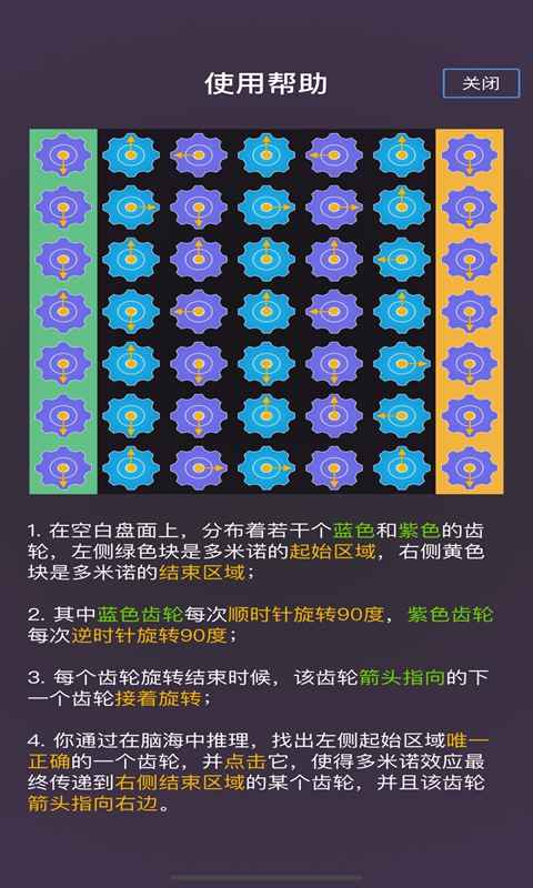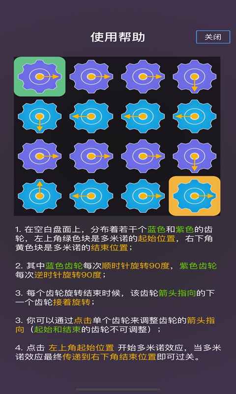 1. 在空白盘面上,分布着若干个蓝色和紫色的齿轮,左侧绿色块是多米诺的起始区域,右侧黄色块是多米诺的结束区域;