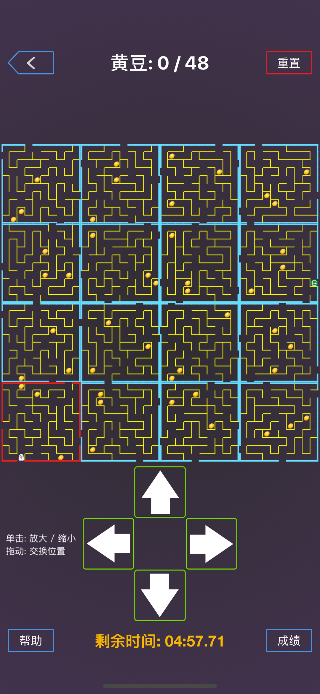 黄豆计划是一个限时迷宫游戏。 玩法说明: 1. 在盘面分布着16个小迷宫,每个迷宫里面有3颗黄豆; 2. 每个小迷宫可以单击放大或缩小,拖动单个迷宫可以与其他迷宫交换位置; 3. 每个小迷宫四边上分别有四个出口,当它跟相邻的小迷宫出口吻合时候,即可通向其他小迷宫;