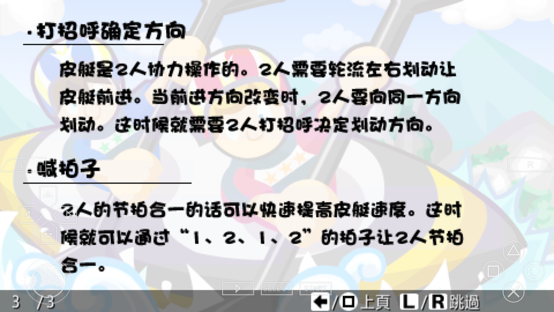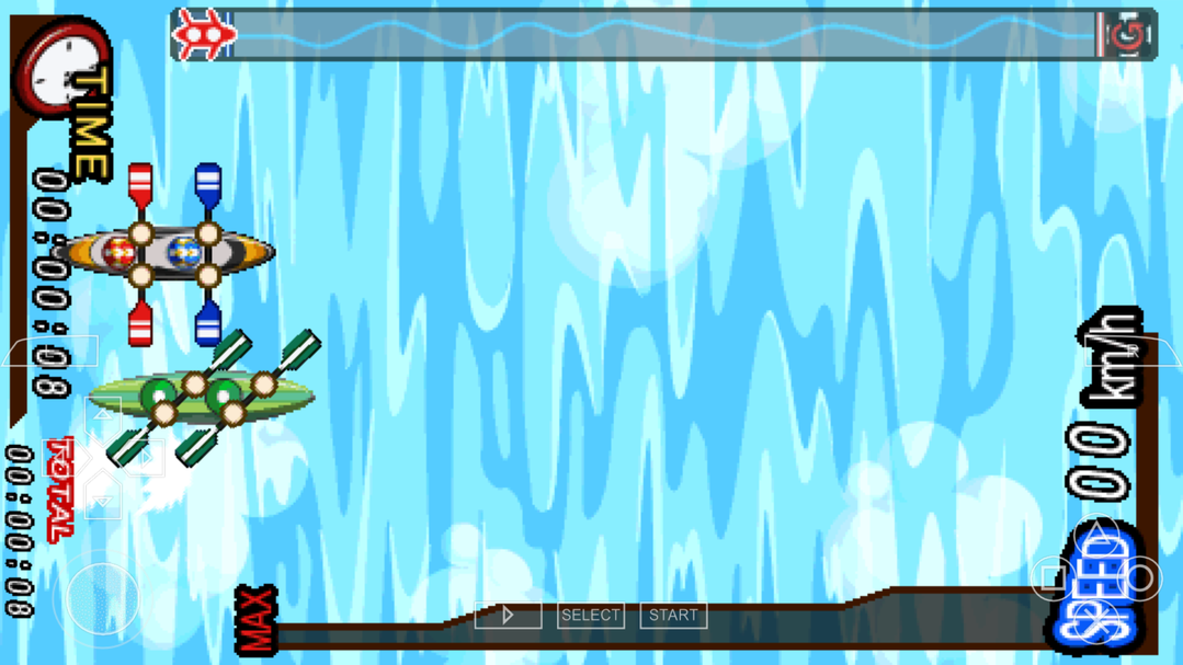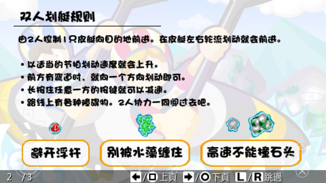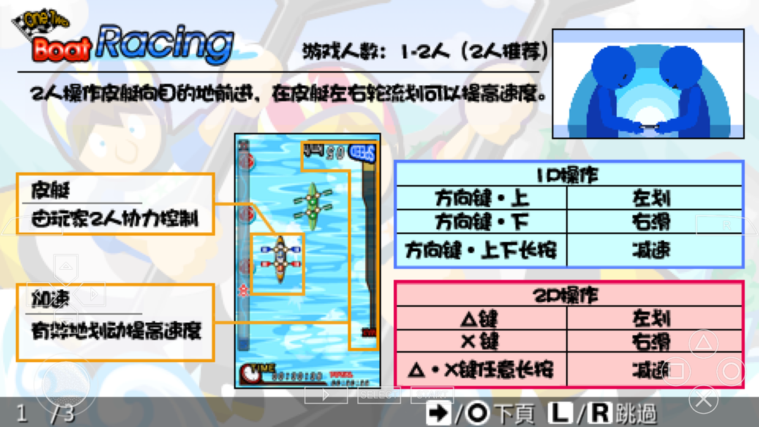 本游戏可供1-2个玩家在1台PSP上游戏。2人需要共同控制小艇到达目的地。轮流有节奏地划水可以增加速度。