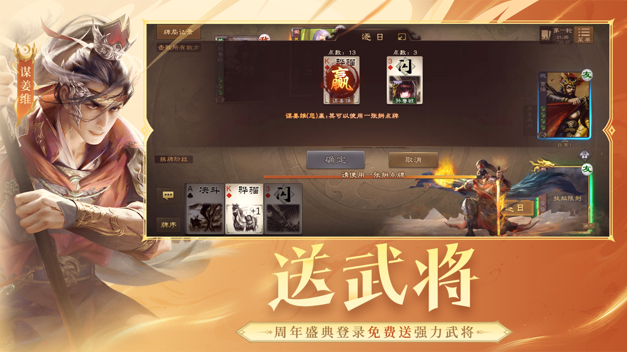 《三国杀OL》是以三国时代为背景的线上卡牌游戏。玩家可扮演三国时期著名人物,根据随机抽中的隐藏身份(主公、反贼、忠臣、内奸),通过使用独特的人物技能,合理打出各种类型的手牌,运筹帷幄、智取搏杀,最终以获得自己所属身份的胜利。《三国杀OL》手游保留网页版核心玩法基础,并针对移动设备设计优化,打造精美简洁的游戏界面、人性化的操作模式,是三国杀品牌与历史文化的传承。