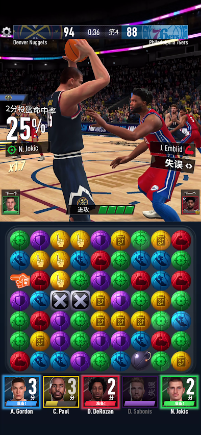 · 通过消除宝石为球员技能充能,然后打出扣篮、快攻、抢断等精彩操作