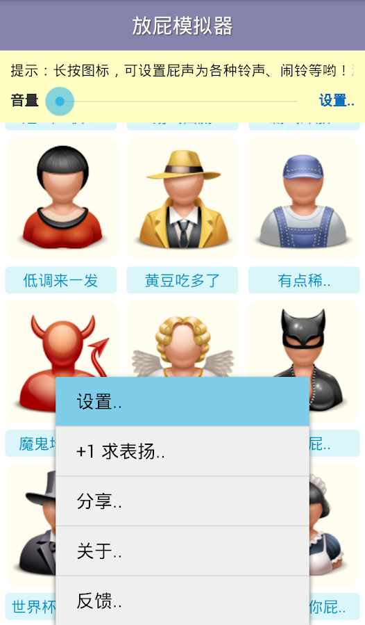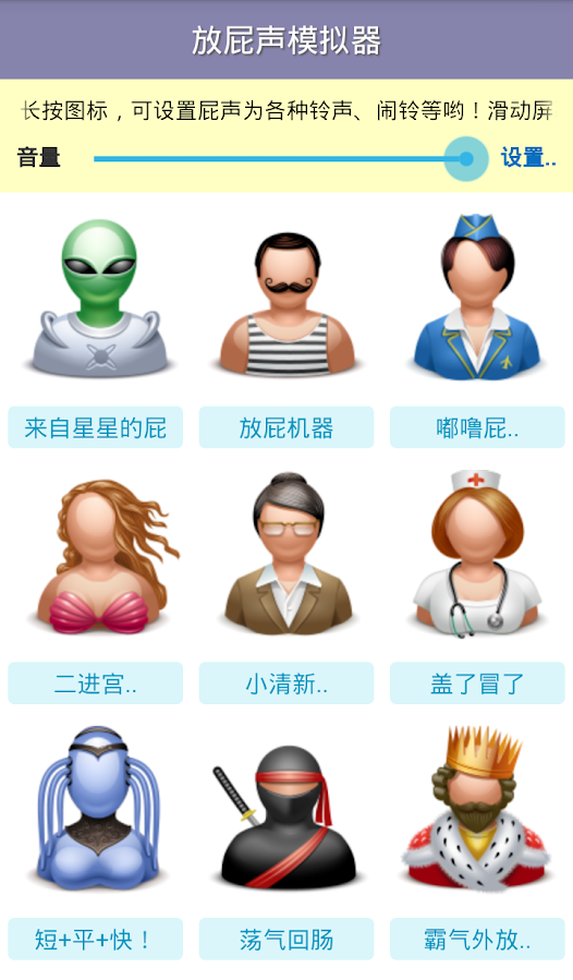 放屁达人,可以模拟各种情况下的屁声,非常的搞笑,并真心欢乐,来自星星的屁、嘟噜屁……