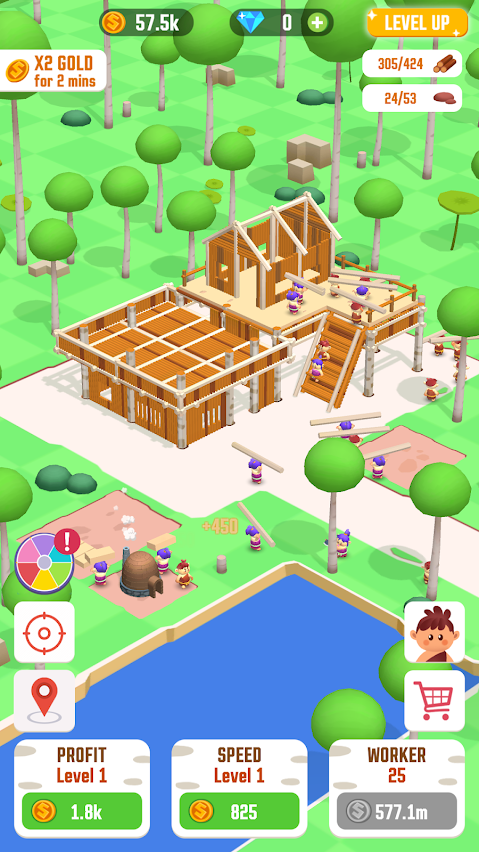 在这个建造者模拟器游戏中,您可以点击赚取金币和钻石。您拥有的硬币越多,您获得的资源就越多。明智地为工人分配不同的任务,从制砖、伐木到房屋建筑。您可以完全控制管理流程以优化工作流程并尽可能完美地建造房屋。