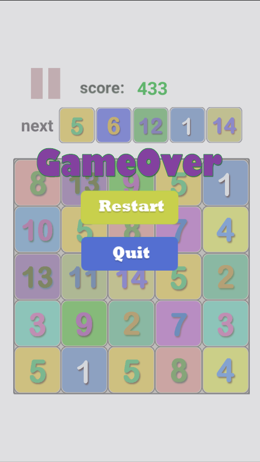 击某一个数字,如果界面中的格子是当前数 字可以到达的(数字可以直线或者对角线移动),那么格子的颜色会变成灰色,然后点击某个灰色的格子, 如果格子中有数字并且等于当前的数字,那么当前数字会移动到选择的灰色格子下,数字会加1并且得到数字加1的分数,然后界面中加载Next 中的数字。直到数字中得到21或者所有的数字都没有可以到达的格子游戏结束