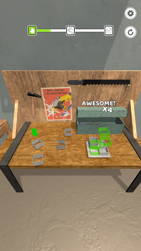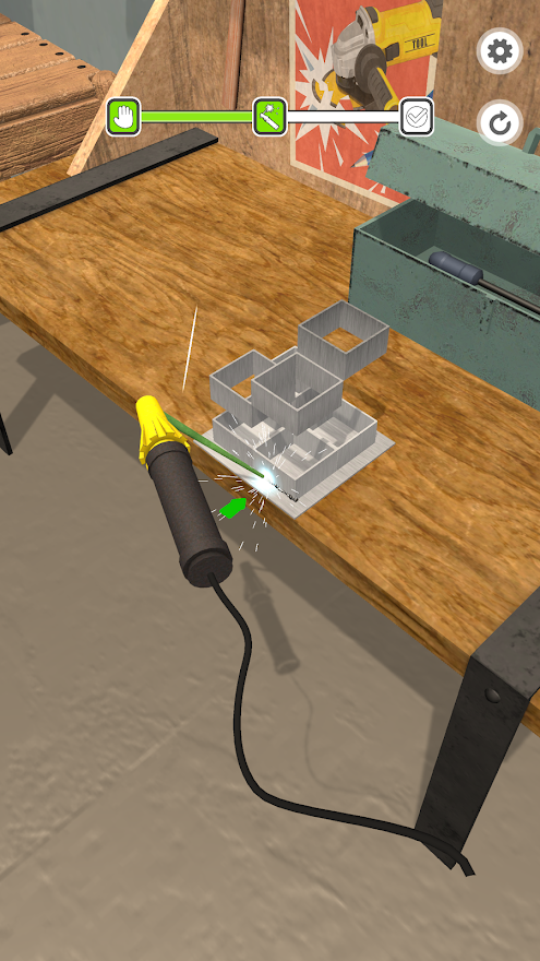 家庭作坊是发挥创意的最佳场所!标记、切割、焊接、钻孔、建造。尽量精确和小心,使您的订单看起来完美。 完成订单并赚钱。 简单有趣的小游戏。用一根手指控制。