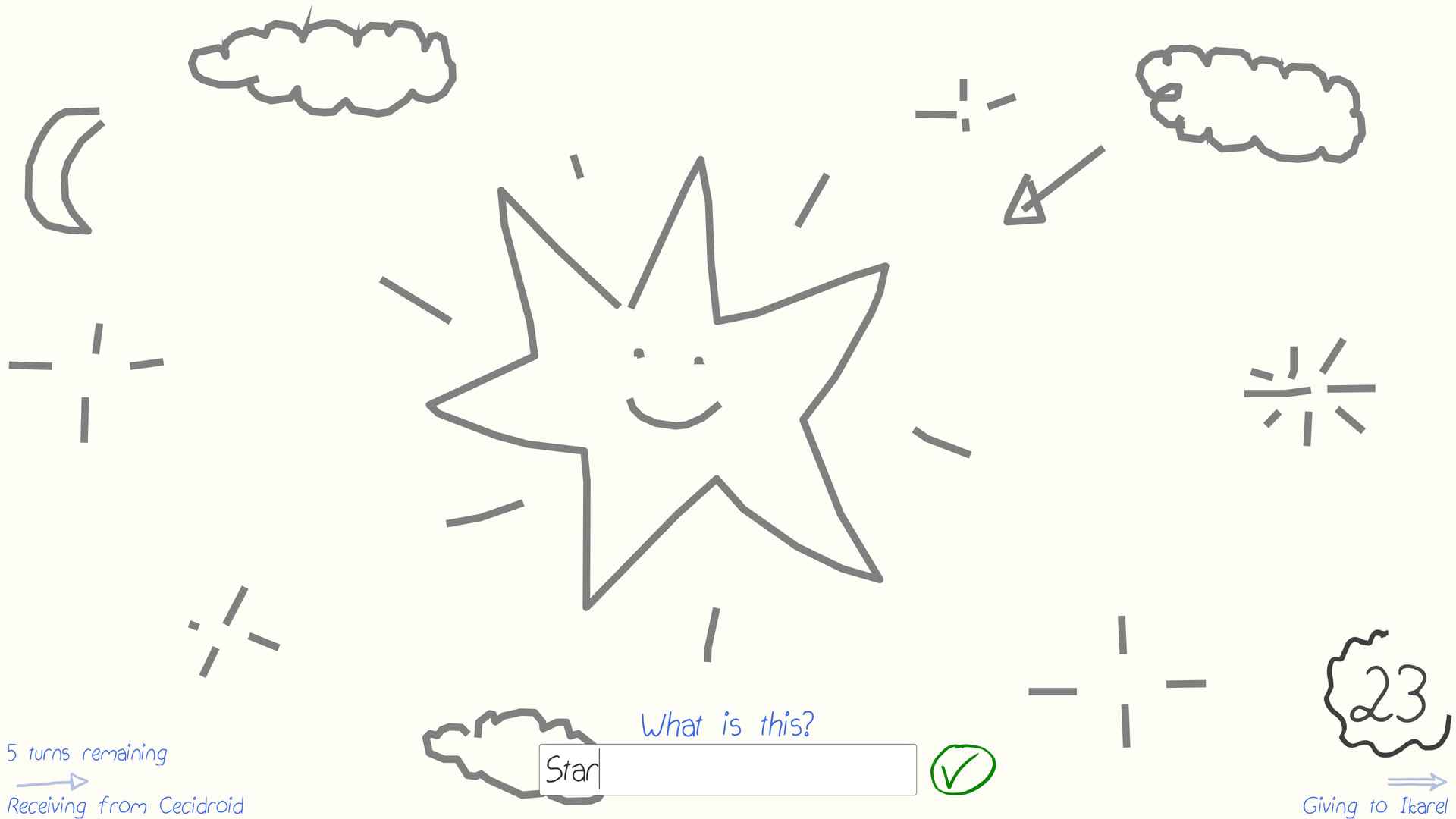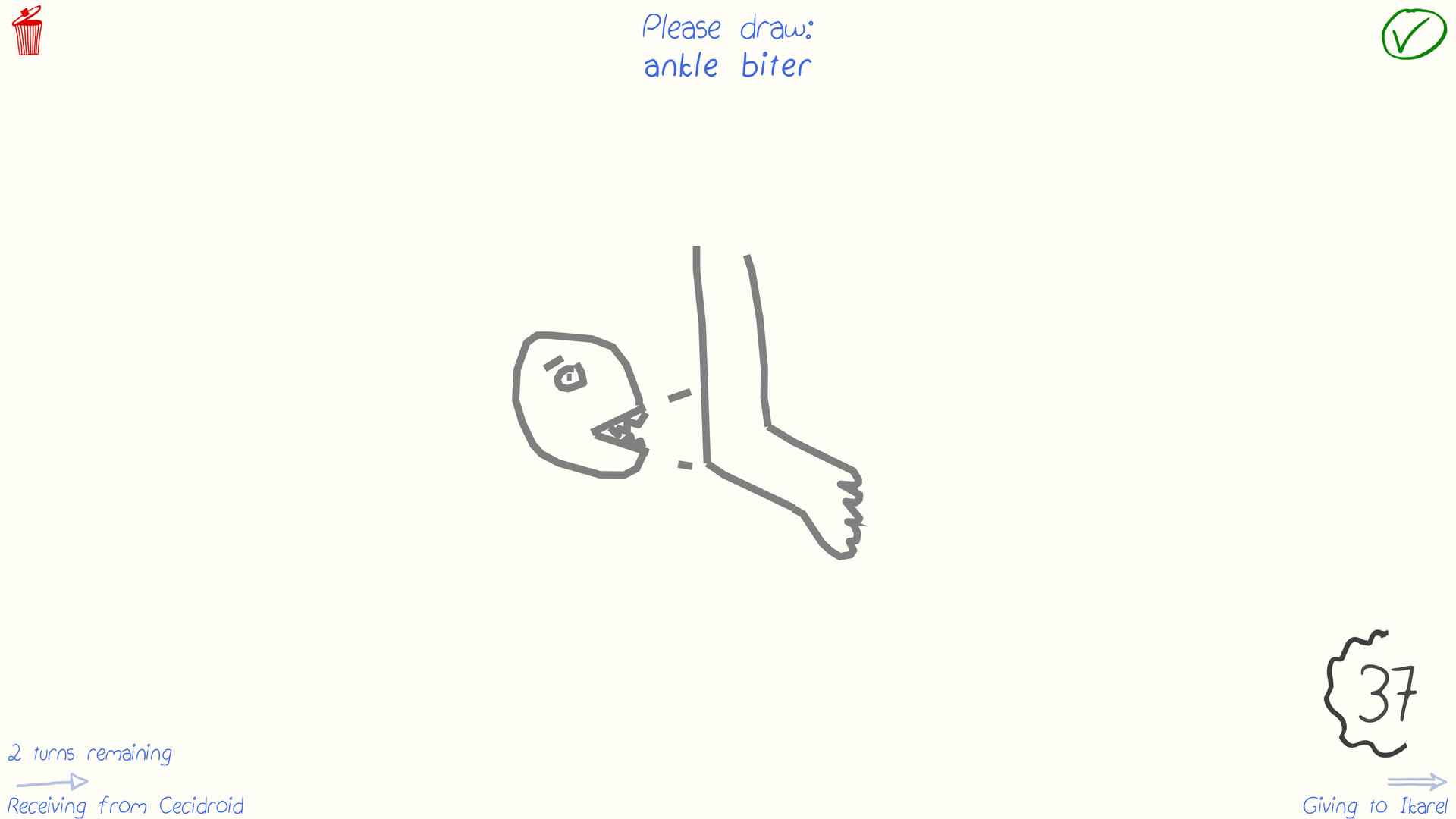你画我猜是一款2-16人(或4-16人,取决于游戏模式)的休闲创意绘图游戏!下一位玩家猜出画想表示的单词。然后另一个人再把它画出来!继续循环,如果最后一个玩家猜对了第一个单词,那就有奖杯!三轮过后,奖杯最多的选手获胜!这真的不是游戏的最大乐趣,你很快就会注意到,你精心制作的图画完全被误解了;-)你画我猜目前提供多种语言的绘图和猜测功能,每种语言都有数百个适合家庭使用的单词可供绘制!自定义你的游戏:*用一种或多种颜色进行经典游戏!*激活速度模式以获得额外的挑战!*想要更多的绘画混乱吗?在隐形模式中,你必须在你的笔触变成隐形的同时进行绘画!支持2-16人的全新游戏模式!选择一个词并把它画出来,让其他人以最快的速度猜出这个词!