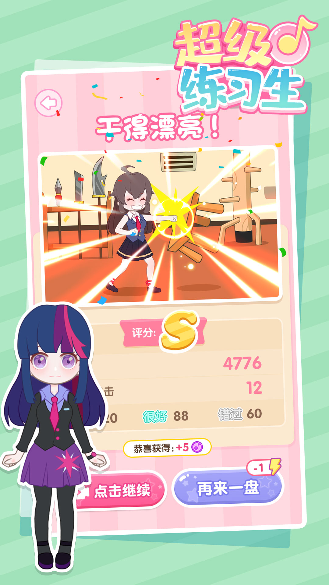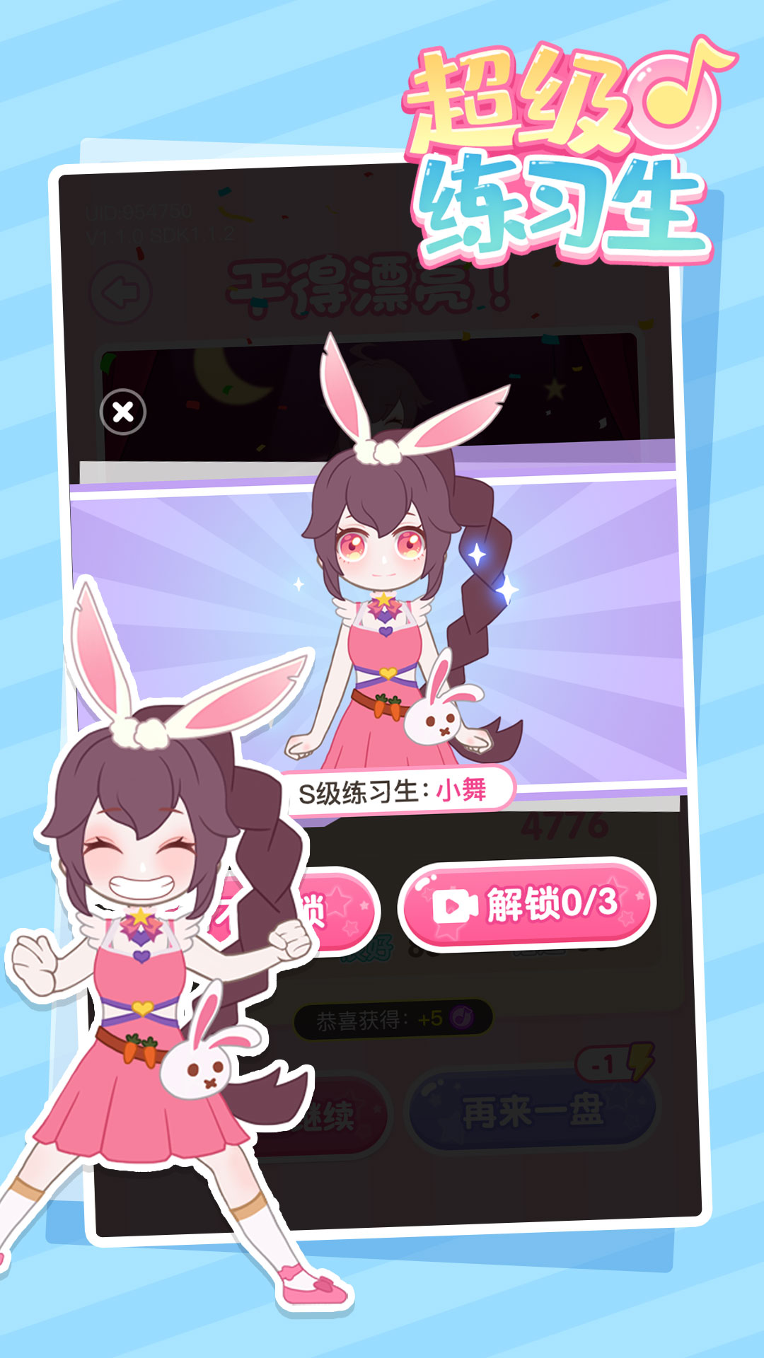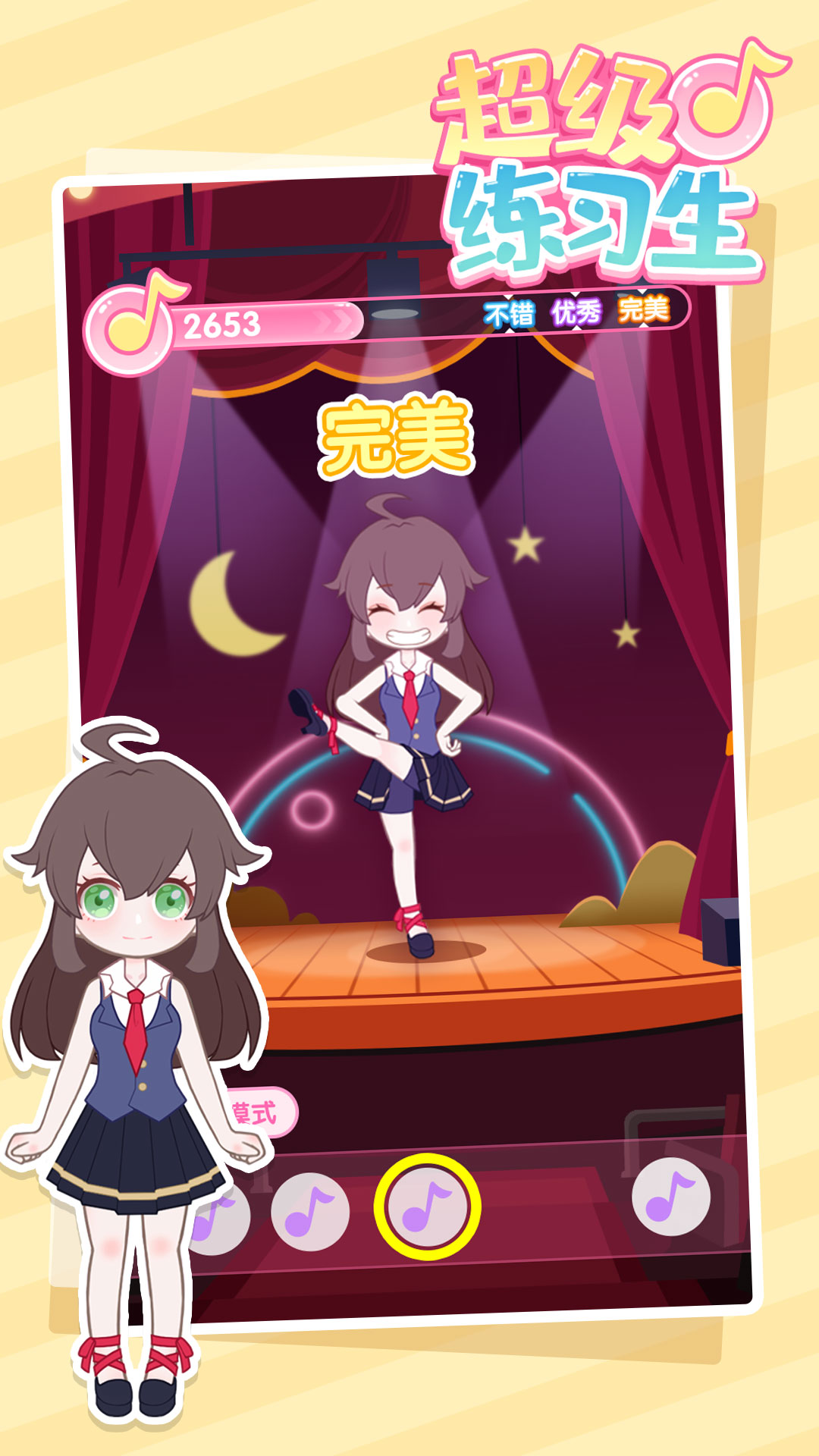 《超级练习生》是一款画风二次元的偶像养成模拟小游戏。游戏中,需要根据音乐节奏,在合适的时机进行点击屏幕的操作,触发节奏打击。最后根据表现进行最终的结算打分。玩家开始需要选择一个“角色”进行扮演,在偶像养成中,需要帮助已有的角色进行体验偶像工作,从体验偶像工作中获得演出经验,来提升玩家已拥有角色的知名度,十分有趣。