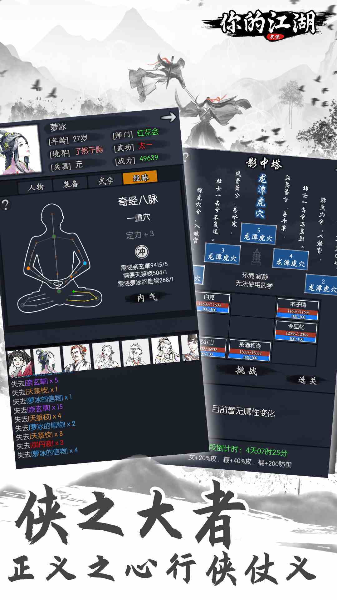 这不是一个人的江湖,你会结识各路豪杰,一同历练,闯荡江湖,登通天塔,江湖论剑,携手侠客行有玩家说,这是一款佛系挂机游戏