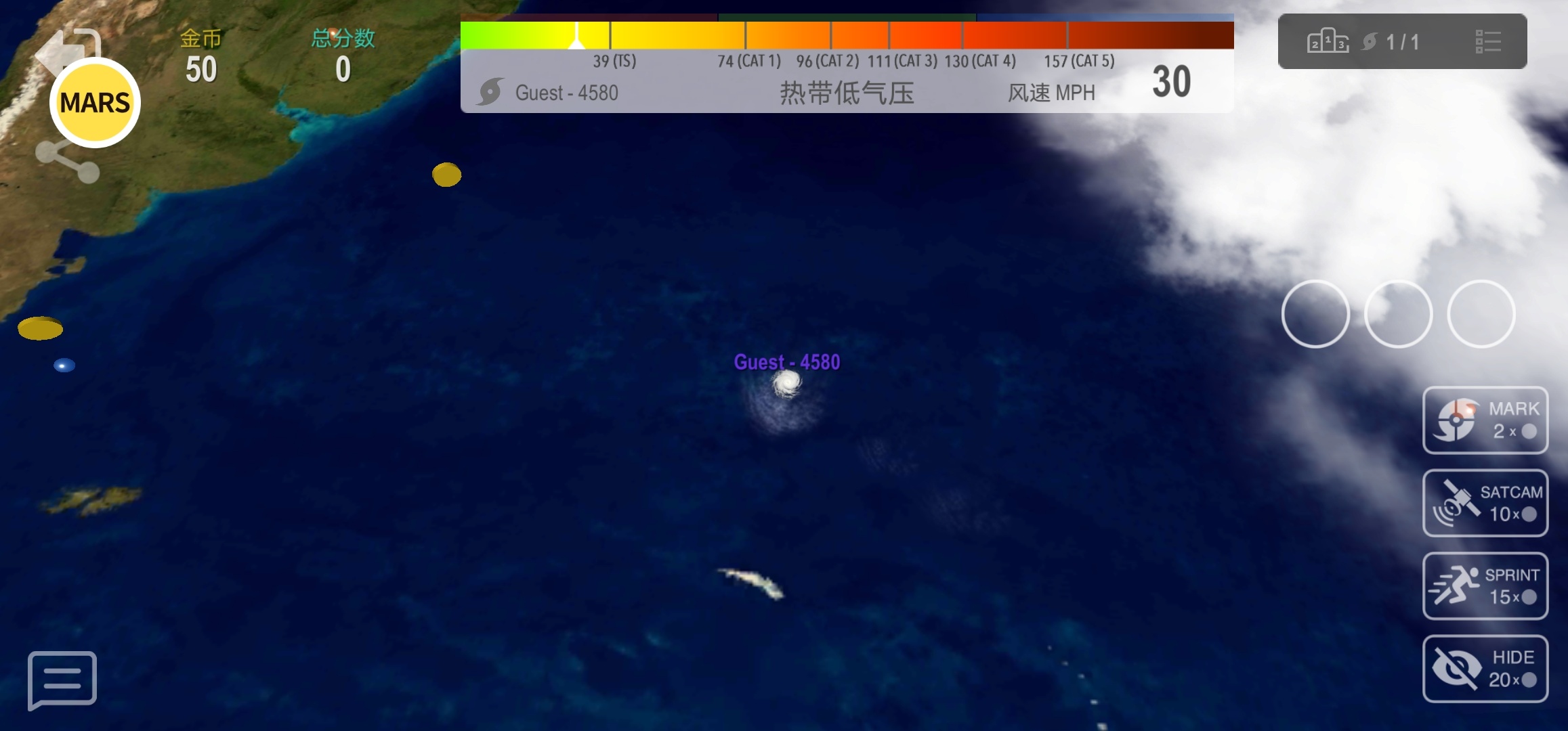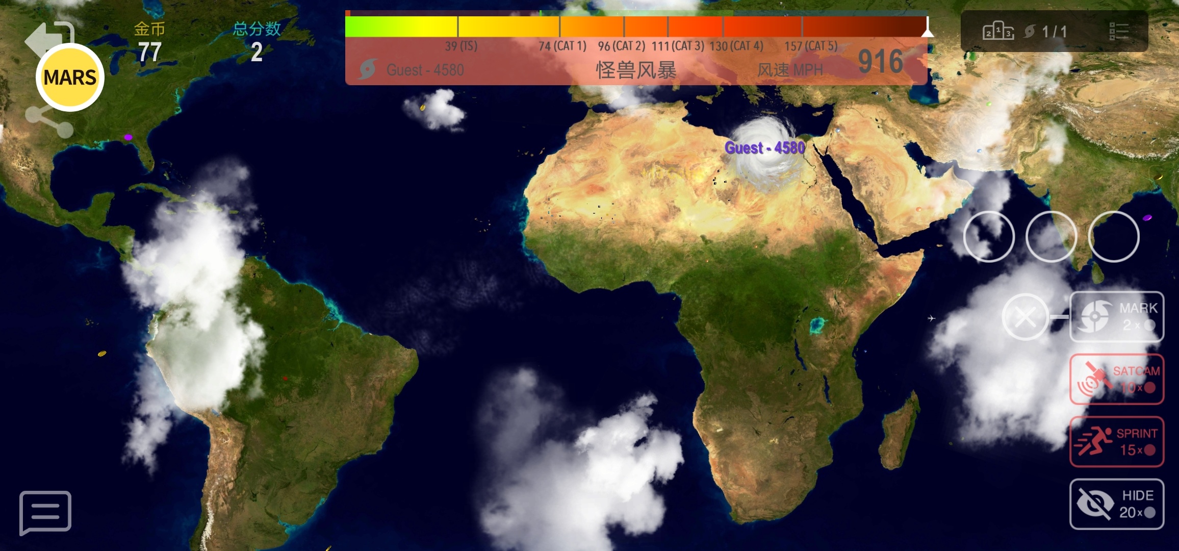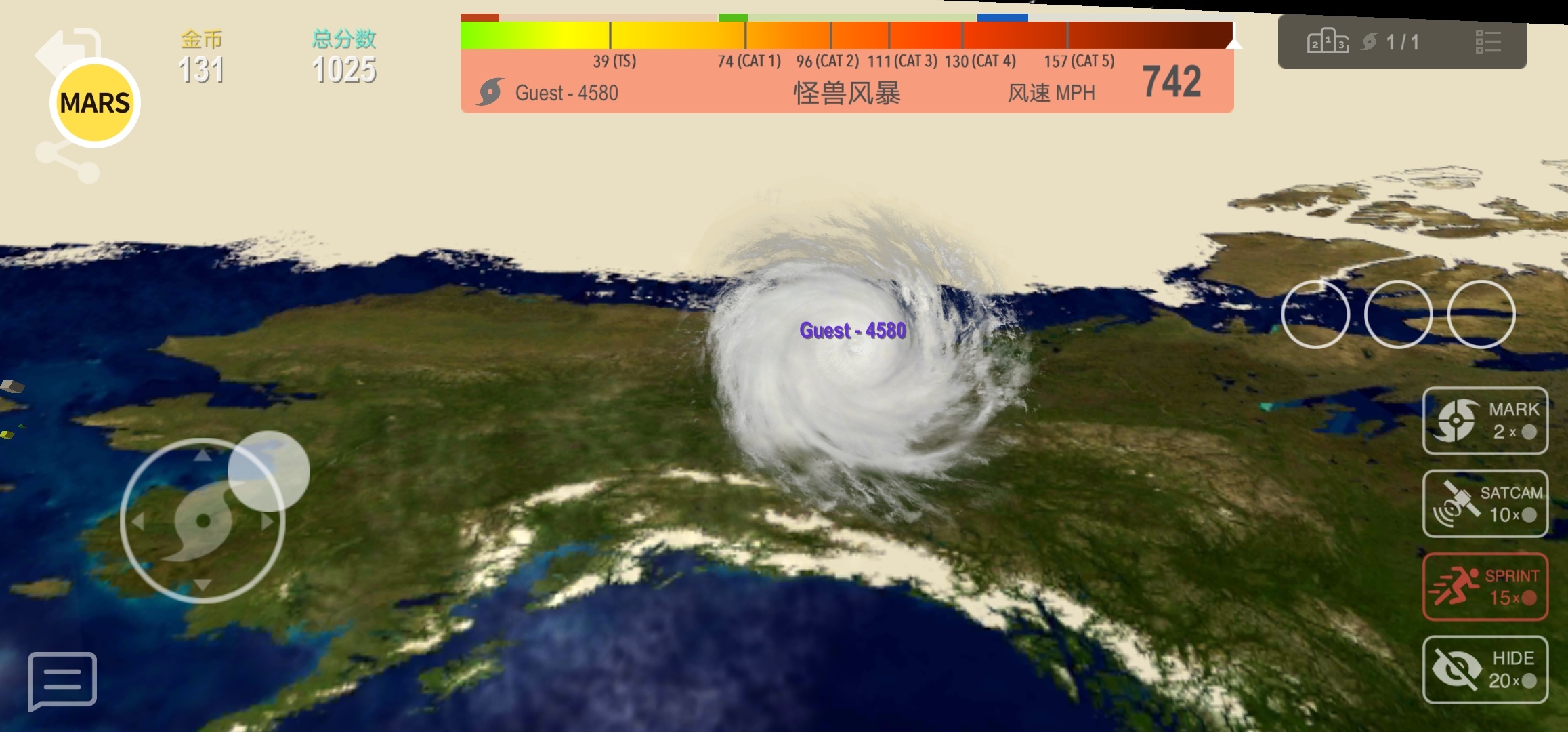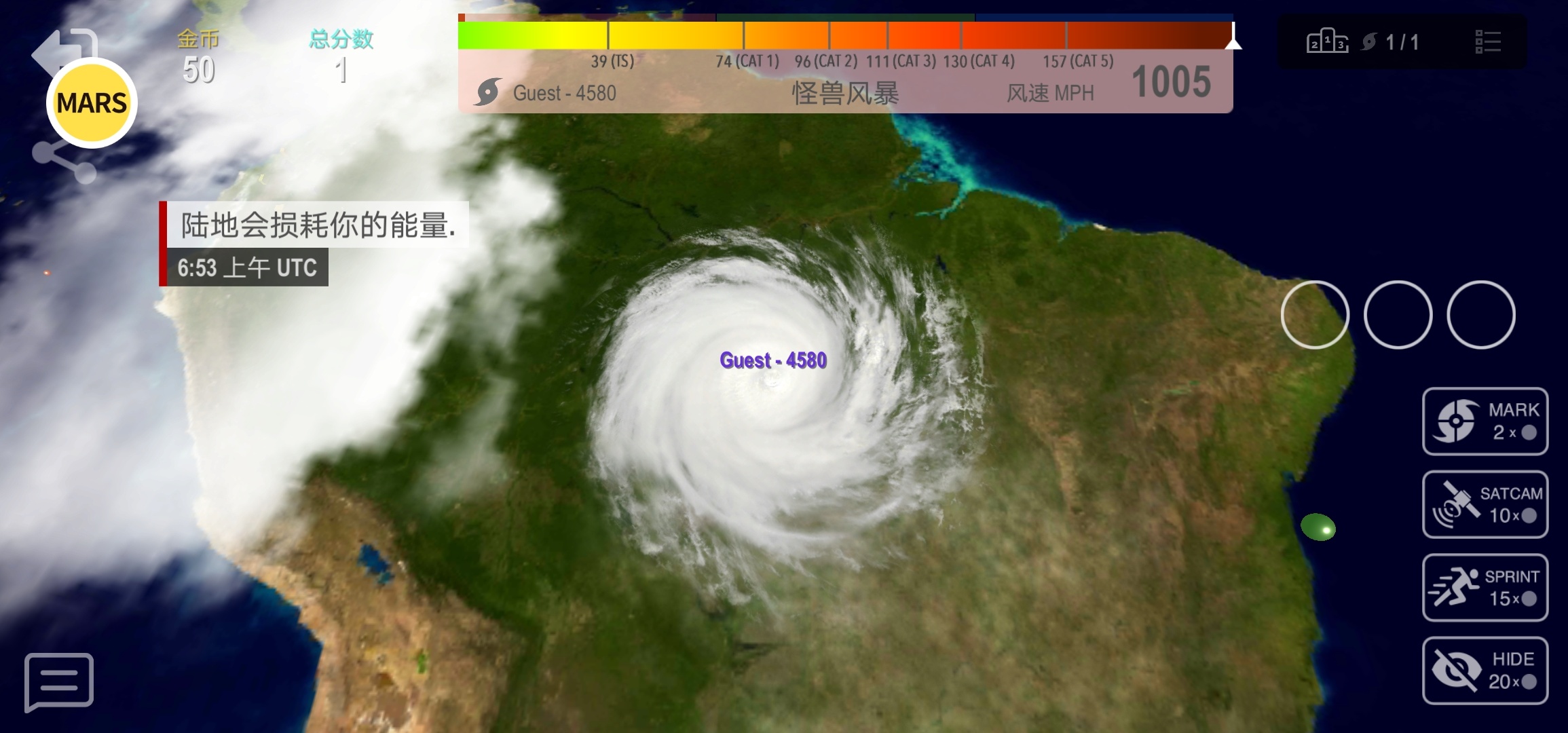 当心其他飓风,它们会想吞噬你。从元素中获取能量:空气(云和热量)和水(来自海洋)。吸收、摧毁和杀死其他飓风会让你成长得更快。