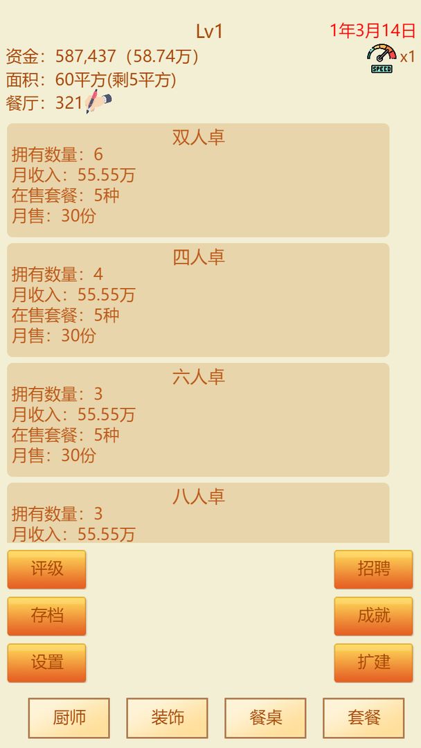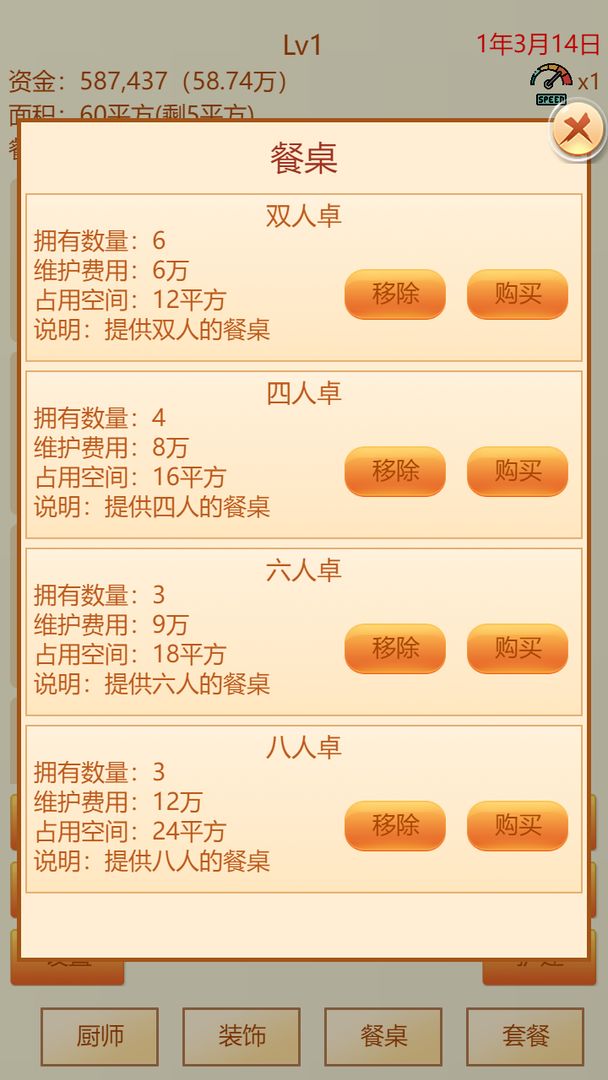 餐卓:有双人卓,四人卓,六人卓,八人卓,每种不同的餐桌卖不同种类的套餐,吸引不同种类的客人 。你可以买任何类型的餐桌和数量,但是请注意你的餐厅面积哦