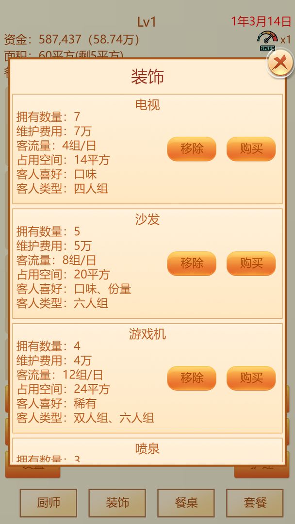 装饰:有多种装饰可以购买,不同的装饰吸引不同的客人喜好和类型,还有不同的客流量。同时需要注意你的餐厅面积哦