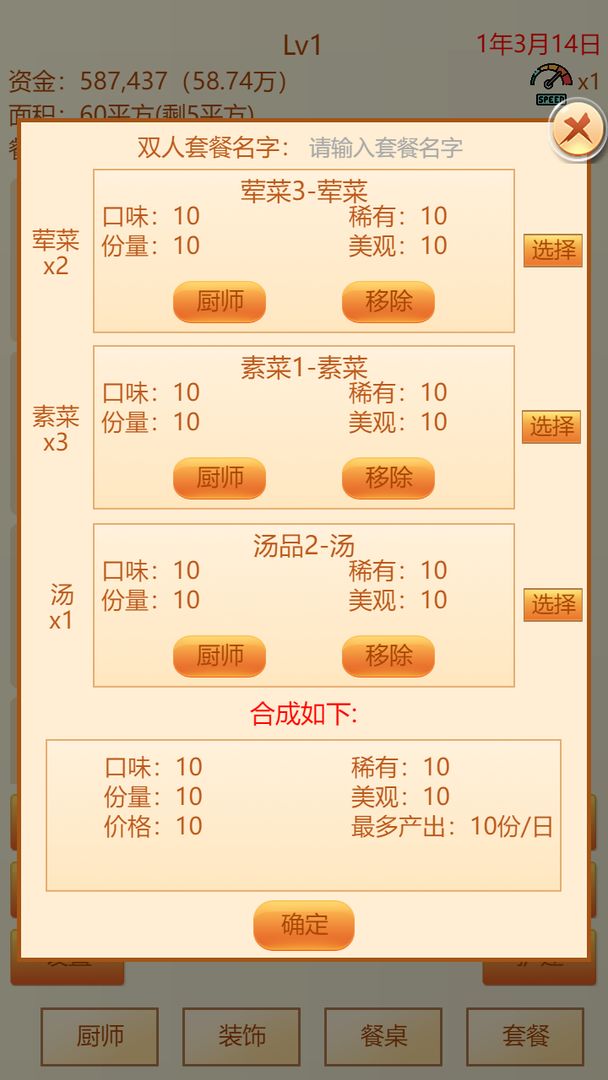 厨师:你可以招聘荤菜,素菜或者汤类型的厨师,每个厨师都有各自的天赋和他们的擅长。同时需要注意他们每日的产出效率,从而赢得更多的销售额