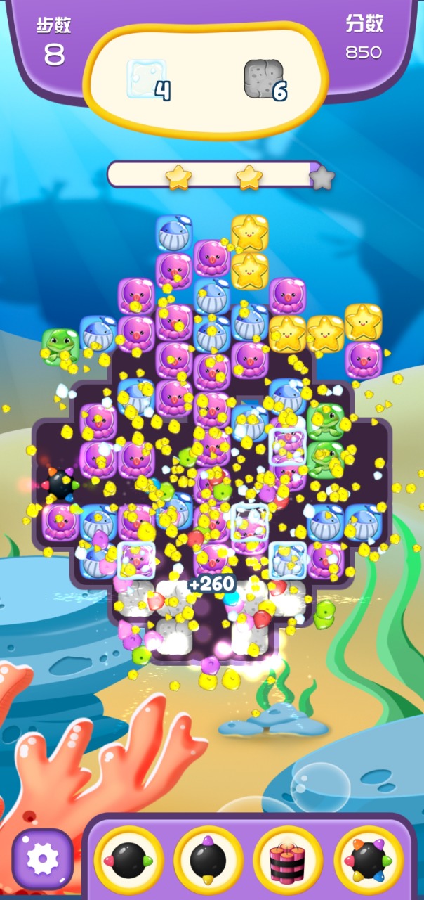 在海底世界体验消消的乐趣。《海星消消乐》带着全新的海洋生物和您见面,让消消游戏更加趣味横生!