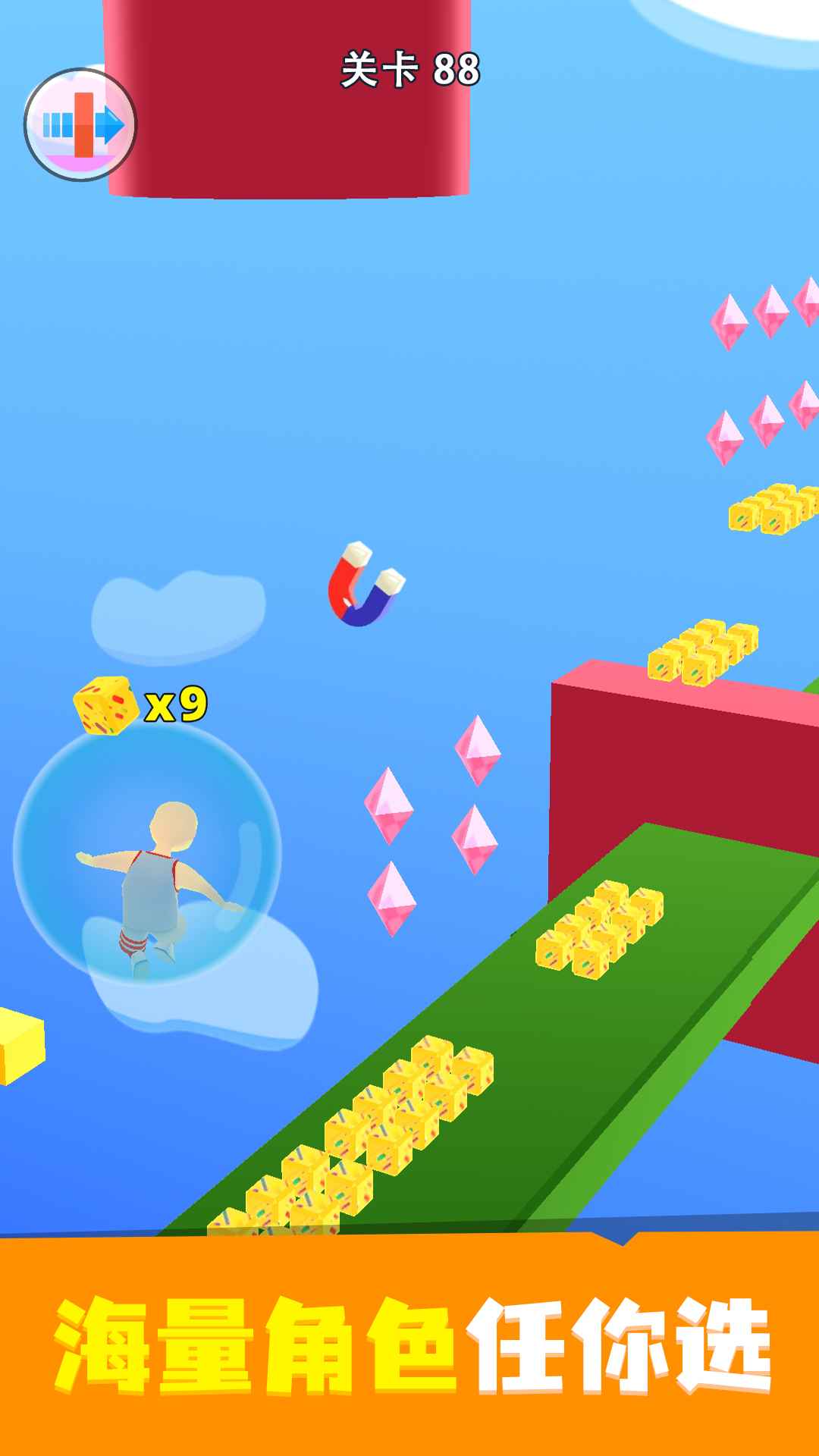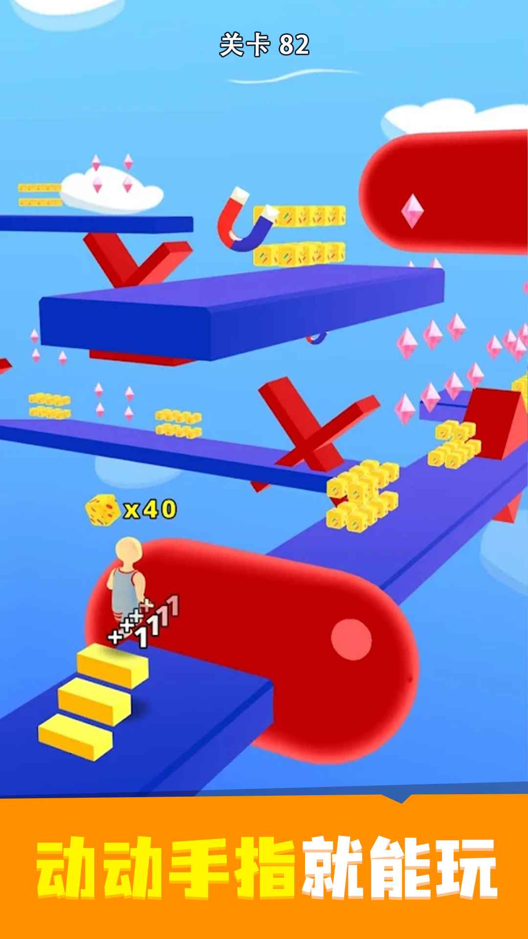 物品:磁铁,x2钻石,穿越障碍会帮助您获得更多钻石并更轻松地克服障碍。当您到达终点线时,尝试尽可能跳到最高的梯子,钻石的数量将乘以相应的楼梯数量。钻石将帮助您升级