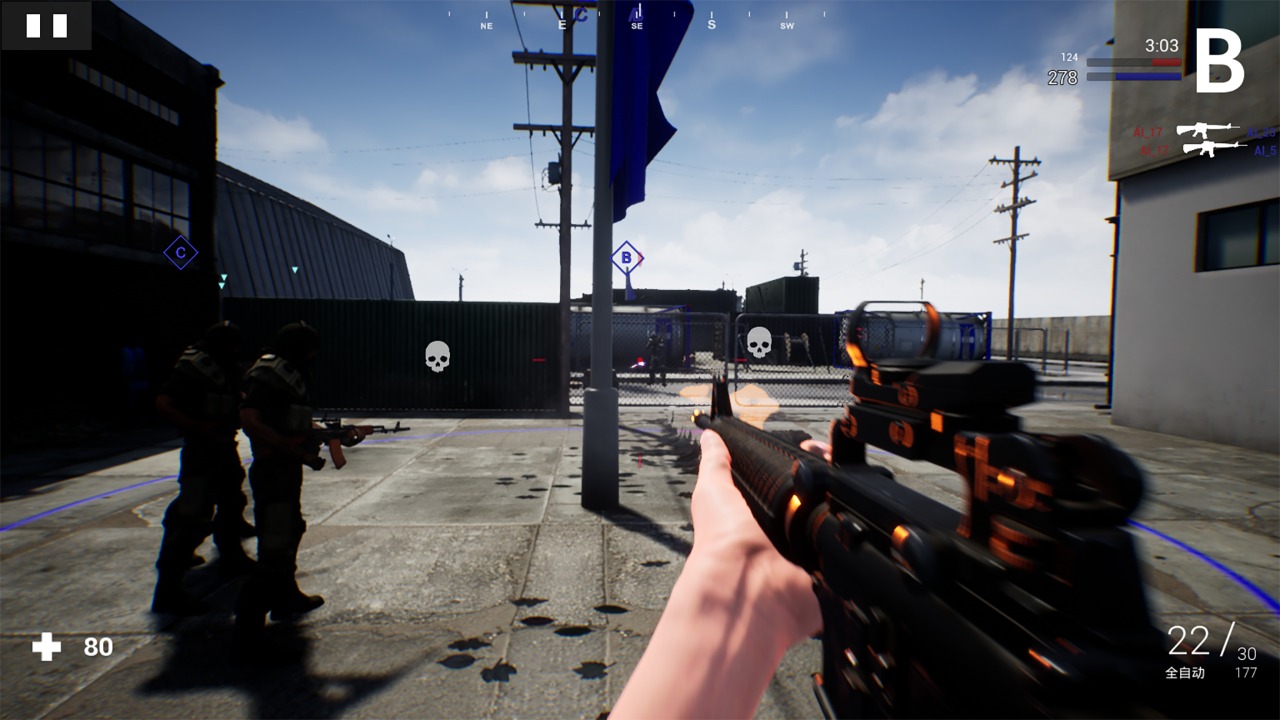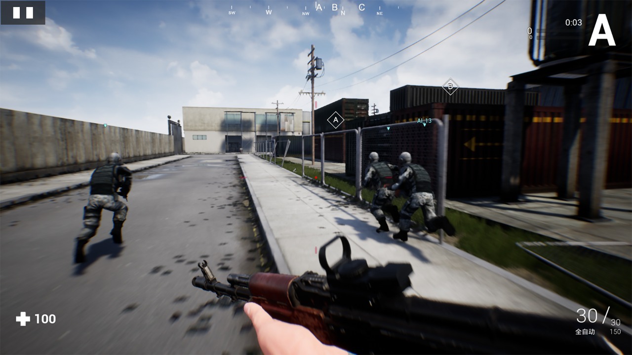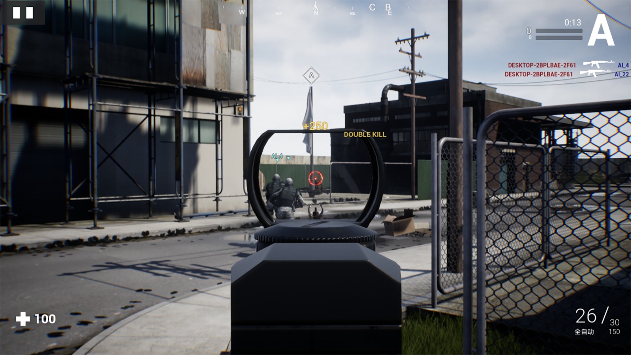 这是一款第一人称射击游戏,游戏内有着多种游戏模式,玩家可以自定义游戏模式和AI数量,在自定义房间训练自身技术。本游戏是在工作之余单人制作,游戏内容还在早期,还请各位玩家多多支持与鼓励。