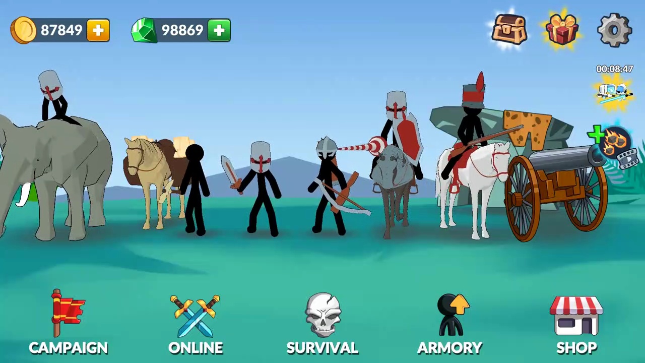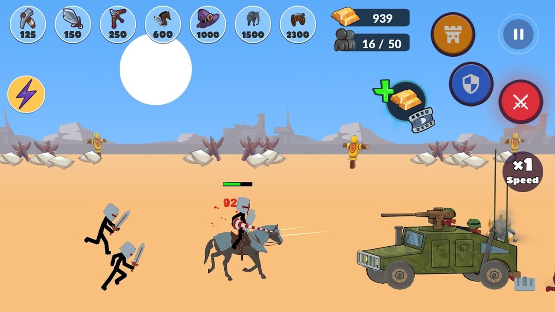 尽可能多地夺取土地和资源,并招募一支强大的军队。您可以使用工人、步兵、火柴人、大炮、骑兵、坦克、直升机,甚至机器人。训练单位并通过从一个军事时代进入下一个军事时代来升级它们。成为文明大战的英雄!