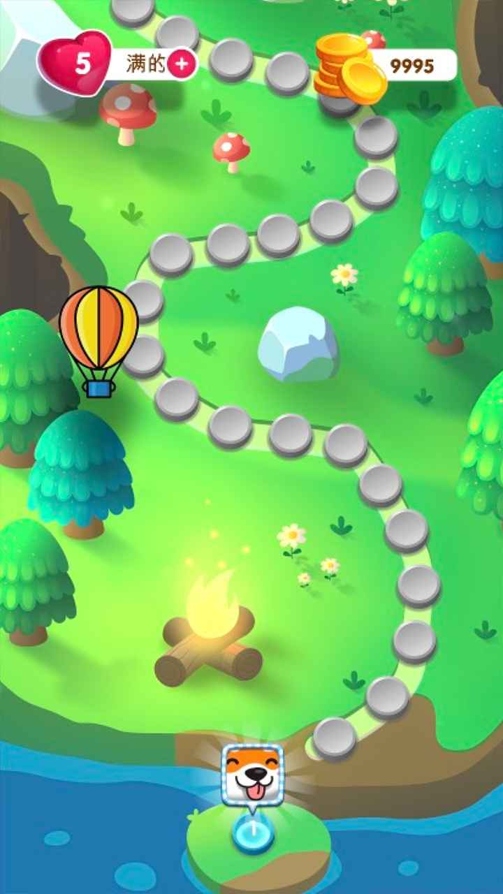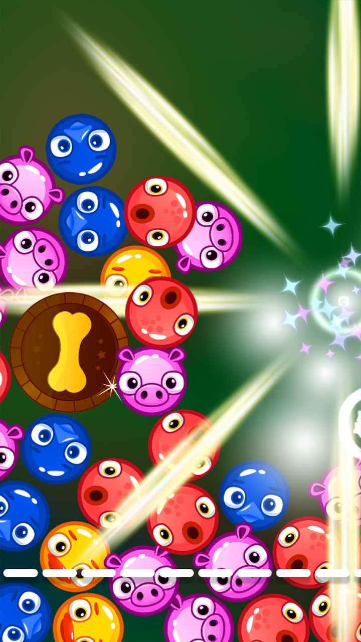 小狗最爱的骨头落在了一堆泡泡上,滑动你的小手将同色的气泡连成一片,尽可能多的选择相同的气泡,除了能获得更多分数外还能合成不同种类的道具,尽快让小狗吃到骨头吧