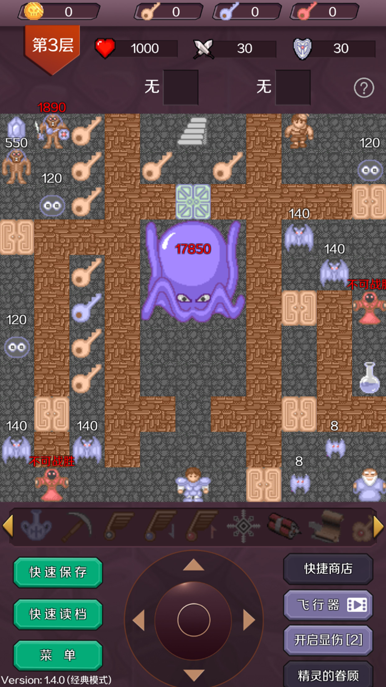 虽然魔塔的界面很像是一般的地牢游戏,貌似随便的打打杀杀就可以过关,但事实上玩这个游戏需要动很多脑筋,任何一个轻率的选择都可能导致游戏的失败,该游戏有属性攻击、防御、生命、金币、经验。对怪物的伤害次数计算公式,是敌人的生命/(自己的攻击-敌人的防御);而伤害的数目计算是怪物伤害次数(敌人的攻击-自己的防御)
