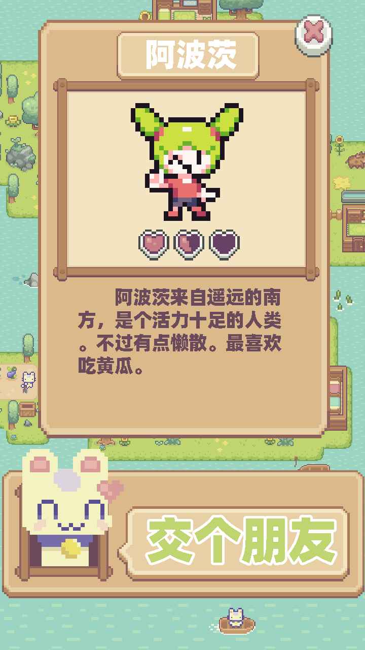 《兔兔的海岛生活》是一款轻松简单地模拟经营单机手游,玩家将扮演海岛管理员来帮助兔兔一起建设岛屿,通过远游来解锁更多的岛屿,更丰富的作物,还可以交到性格各异的小伙伴,一起在这个海岛上轻松生活吧~咕叽~