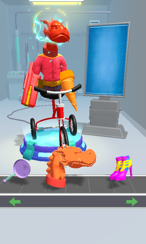 在你的身体上安装所需的部位,这会产生强大的效果。钻、水龙头、枪、自行车、螺旋桨、吹风机和其他有趣的道具,你可以在游戏中尝试。选择正确的部分,跨越不同的障碍,打败敌人,达到目的。