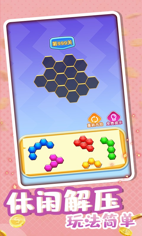 百关智多星这游戏的玩法借鉴了俄罗斯方块的玩法,但同时又带有自己独创的地方。玩家们需要在不同的六边形组合当中,通过拼接各个形状的小六边形碎片来进行组合。当玩家完全的切合组合好图形后即可过关,快来开发你的大脑吧!