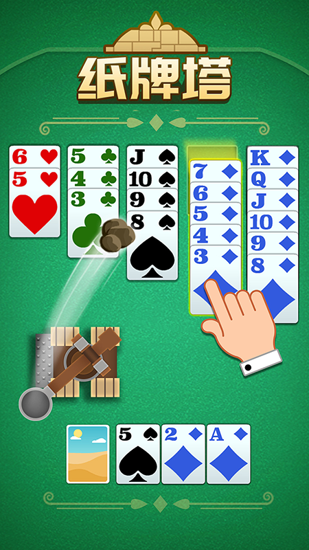 纸牌塔游戏全新上线,纸牌和益智相结合的经典游戏,具有规则简单,操作灵活等特点,试玩一下,一定能让你挑灯夜战,欲罢不能!你需要利用自己的智慧解开牌局,最顶层有四个格子对应纸牌的四种花色,游戏的目标是以最少的移动次数将牌面中的十六组牌以每次三张向右推动,根据纸牌的顺序从A~K全部摆放,只要花色和顺序正确,最顶层的纸牌会根据顺序吸引同花色的纸牌上去,只要把所有纸牌都按花色收集完成,游戏获胜。所以每一次向右滑动纸牌的机会都很宝贵,合理利用智慧去完成目标。游戏特点:·如果你陷入僵局–提示、回收、后退和洗牌都能帮助你取得胜利·各种各样的背景、卡牌背面让你自定义喜欢的游戏外观充满挑战,又可以获得无穷的乐趣,是你和朋友渡过闲暇时光的不二选择,赶紧来尝试一下吧!!!