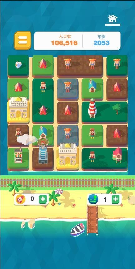简单容易上手的休闲小游戏,通过不断的合成地块,升级建筑,可以积累更多的人口,不断的超越自己,让我们来建造一个自己的超级大厦吧!