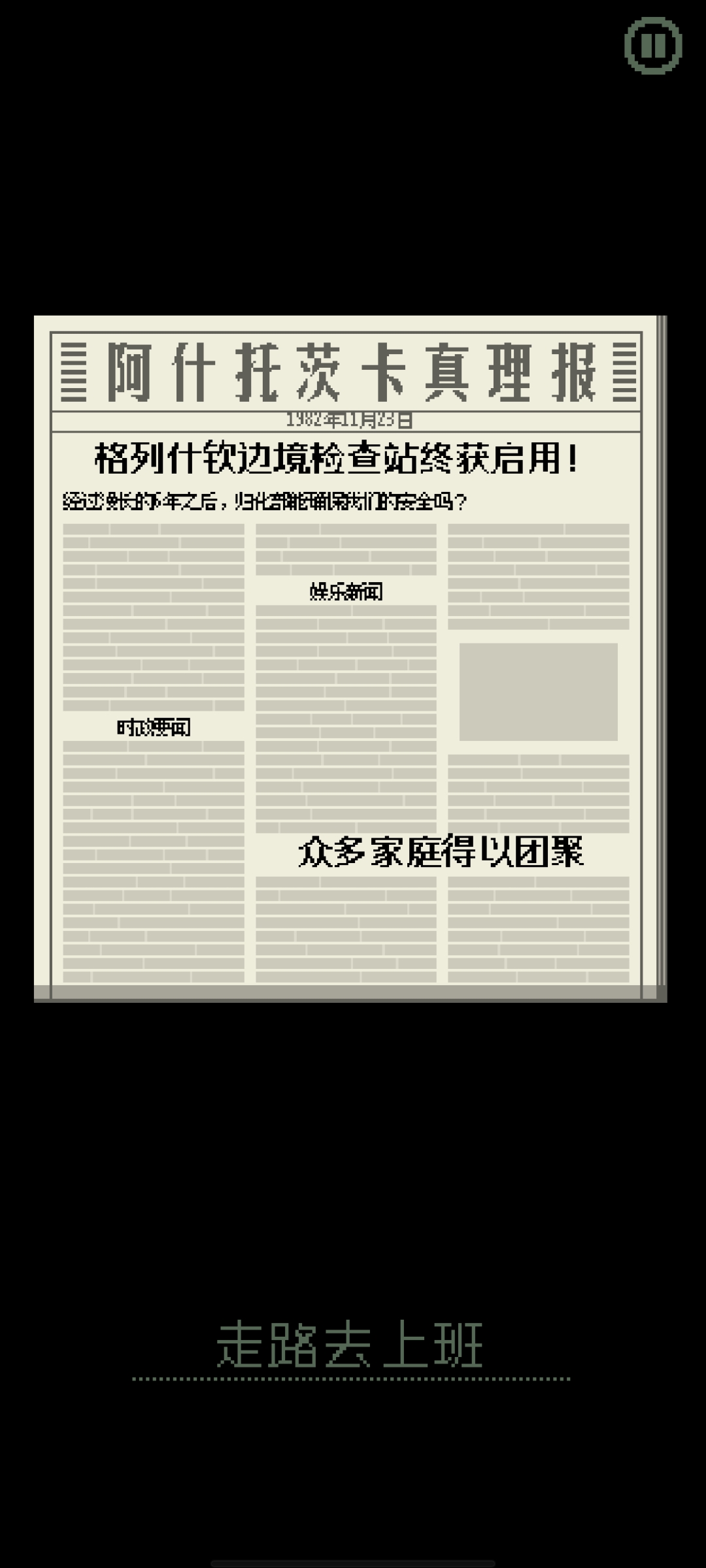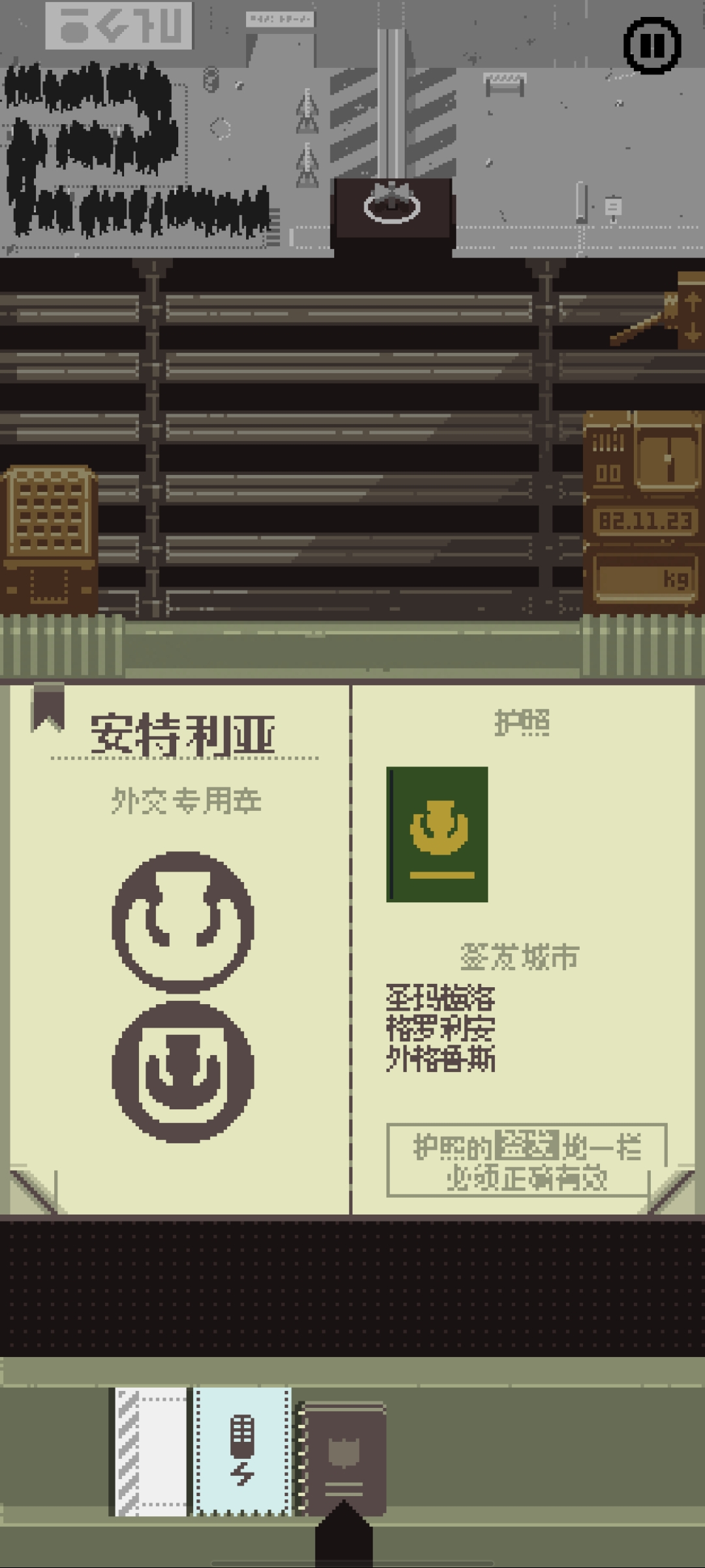 这是一个十分耐玩且有代入感的像素风游戏,架空的世界观,几个虚拟的国度,你作为一个边境检察官,每天在一个小亭子里查查证件,这个游戏最有意思的地方就是在交互,真的代入感超级强。而且游戏中的选择也很令人难忘。我有印象深刻的几个例子, 有一对夫妇逃难来了你的国度,但是只有那个男的证件是齐的,那个女的证件不齐,你让不让过? 你手头上没钱,家人饥寒交迫,还生病了,这时候来那个走私的,他想给你点钱,你是选择原则还是选择家人? 同事的女票来你的国度,证件不全让不让进? 同事的女票来你的国度,证件不全让不让进? 有人说你的国度是一个危险的国度。你是听信不明人员的话协助他们,还是克尽职守? 不过好在,前两单判错了,只会吃单子,第三单开始才是罚钱,而且每天最多一个走私,基本都是5~10块。吃罚单罚五块钱,可能能赚个十块钱。 (血赚不亏) 偶尔你还能赚点外快,有些人会让你帮忙招聘一些特定职业的人(例如工程师)然后给你点钱。 还有些,人。。。。会让你笑个半死。 偶尔你还能赚点外快,有些人会让你帮忙招聘一些特定职业的人(例如工程师)然后给你点钱。 还有些,人。。。。会让你笑个半死。 你:“这照片是你吗?”对面:“是”你:“真的吗?对面:“是,我那个时候还很瘦。”你:“这就不是你。”对面:“我也说这不是我。可是我去照相馆的时候,他就是给我这张,我就看护照上面有个地方,我就贴了”(经典永流传)这种人嘛,一般要么被赶回去,要么变成两块五(你有权利拘留证件不齐的人,而且拘留两个五块钱,那一个不就是2块5嘛) 还有个憨憨(红衣老头),入境的时候,当着你的面拿出两本护照然后说,啊,请把那一本还给我 (。>∀<。)我直接笑麻了 (。>∀<。)我直接笑麻了 还有一些突发事件,比如说你下班最后一单快做完的时候,突然来了个恐怖分子,直接导致你提前回家(血压up)再要么你做到一半就给你跑来boom的一下。。。。。(血压拉满)不过好在你是有麻醉枪的,可以对这群小面包们来一枪,啊,顺带一提,打中20块哦(没空过) 到了游戏中后期会叫你逮捕通缉犯,就是会给你几张照片,然后偶尔来一个通缉犯,相信我,如果你缺钱的话,你会巴不得碰到他们来。如果真的碰到了,下一位,等等?孙zei~你不通缉犯吗?喂,守卫吗?男兵一位,两块五里面请~ 游戏一共二十多种结局,其中有三个是真结局,分别是逃难,恪尽职守,推翻政府。如果你想看剧情的话,真心推荐你玩一下。