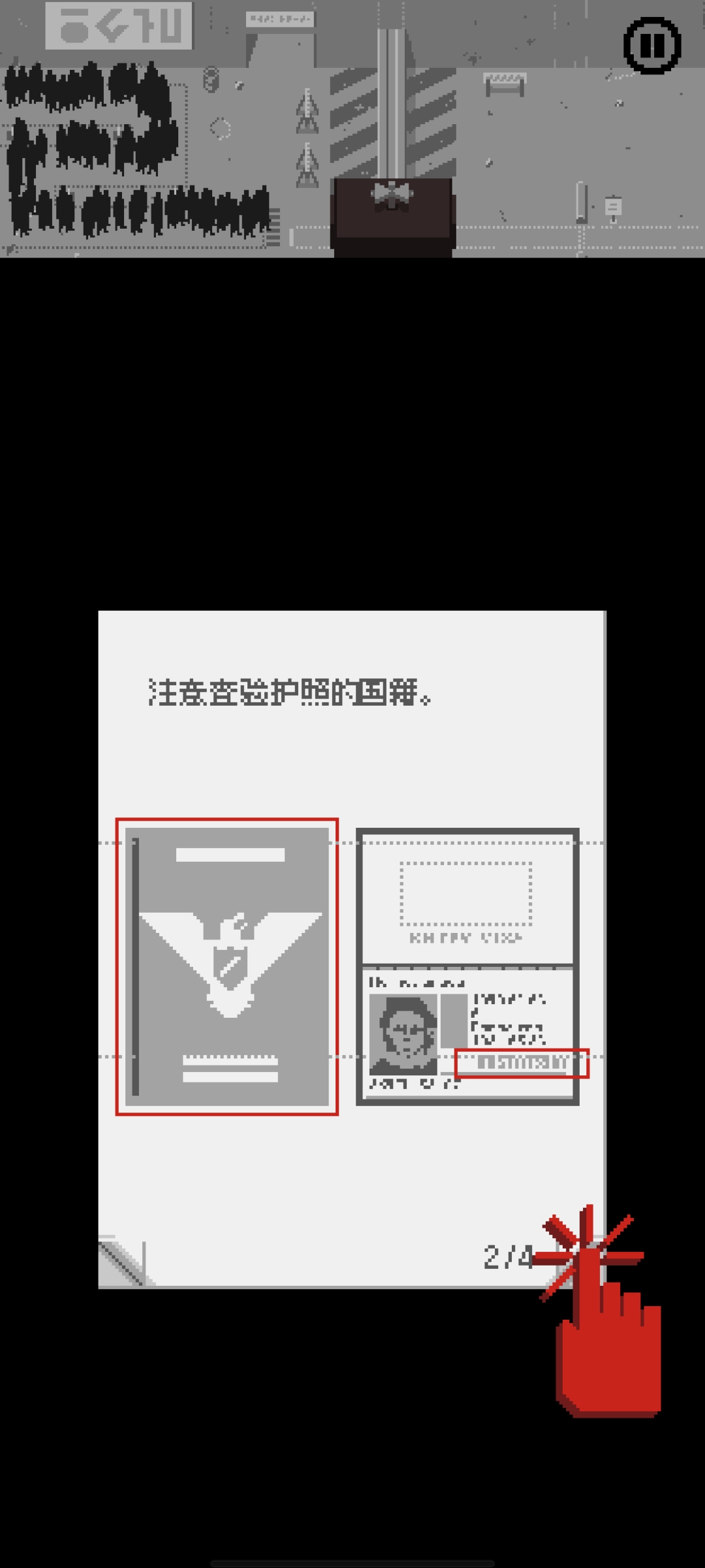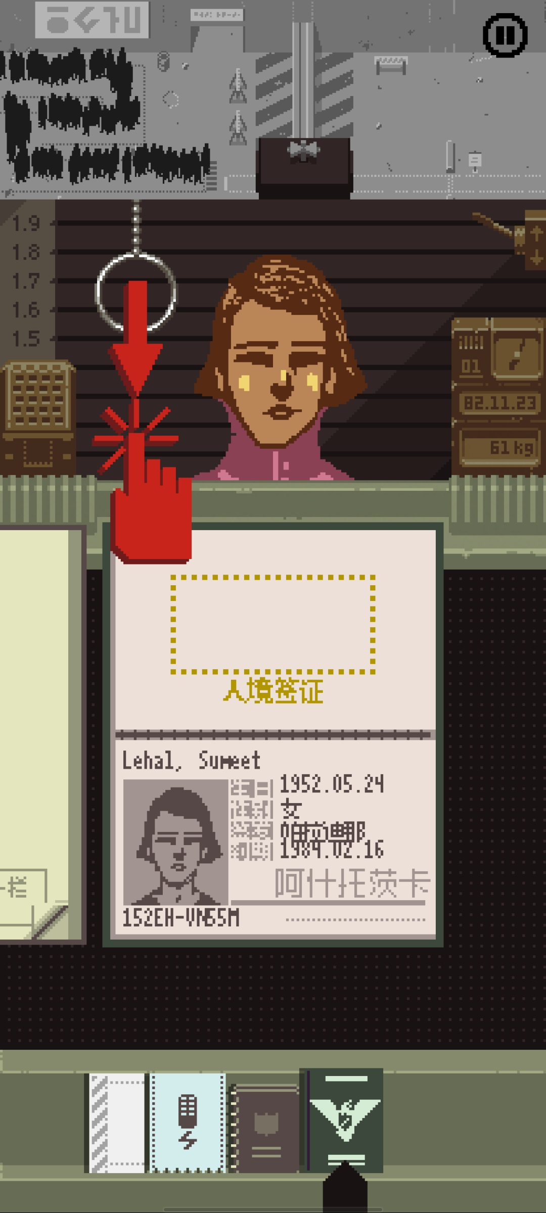 这是一个十分耐玩且有代入感的像素风游戏,架空的世界观,几个虚拟的*,你作为一个边境检察官,每天在一个小亭子里查查证件,这个游戏最有意思的地方就是在交互,真的代入感超级强。而且游戏中的选择也很令人难忘。我有印象深刻的几个例子, 有一对夫妇逃难来了你的*,但是只有那个男的证件是齐的,那个女的证件不齐,你让不让过? 你手头上没钱,家人饥寒交迫,还生病了,这时候来那个走私的,他想给你点钱,你是选择原则还是选择家人? 有人说你的*是一个危险的*。你是听信不明人员的话协助他们,还是克尽职守? 不过好在,前两单判错了,只会吃单子,第三单开始才是罚钱,而且每天最多一个走私,基本都是5~10块。吃罚单罚五块钱,可能能赚个十块钱。 还有些,人。。。。会让你笑个半死。 你:“这照片是你吗?”对面:“是”你:“真的吗?对面:“是,我那个时候还很瘦。”你:“这就不是你。”对面:“我也说这不是我。可是我去照相馆的时候,他就是给我这张,我就看护照上面有个地方,我就贴了”(经典永流传)这种人嘛,一般要么被赶回去,要么变成两块五(你有权利拘留证件不齐的人,而且拘留两个五块钱,那一个不就是2块5嘛) 还有个憨憨,入境的时候,当着你的面拿出两本护照然后说,啊,请把那一本还给我(。>∀<。) 还有一些突发事件,比如说你下班最后一单快做完的时候,突然来了个恐怖分子,直接导致你提前回家(血压up)再要么你做到一半就给你跑来,血压真的会高。不过好在你是有麻醉枪的,可以对这群小面包们来一枪,啊,顺带一提,打中20块哦。 到了游戏中后期会叫你逮捕通缉犯,就是会给你几张照片,然后偶尔来一个通缉犯,相信我,如果你缺钱的话,你会巴不得碰到他们来。如果真的碰到了,喂,守卫吗?男兵一位,两块五里面请~ 游戏一共二十多种结局,其中有三个是真结局,分别是逃难,恪尽职守,推翻政府。如果你想看剧情的话,真心推荐你玩一下。