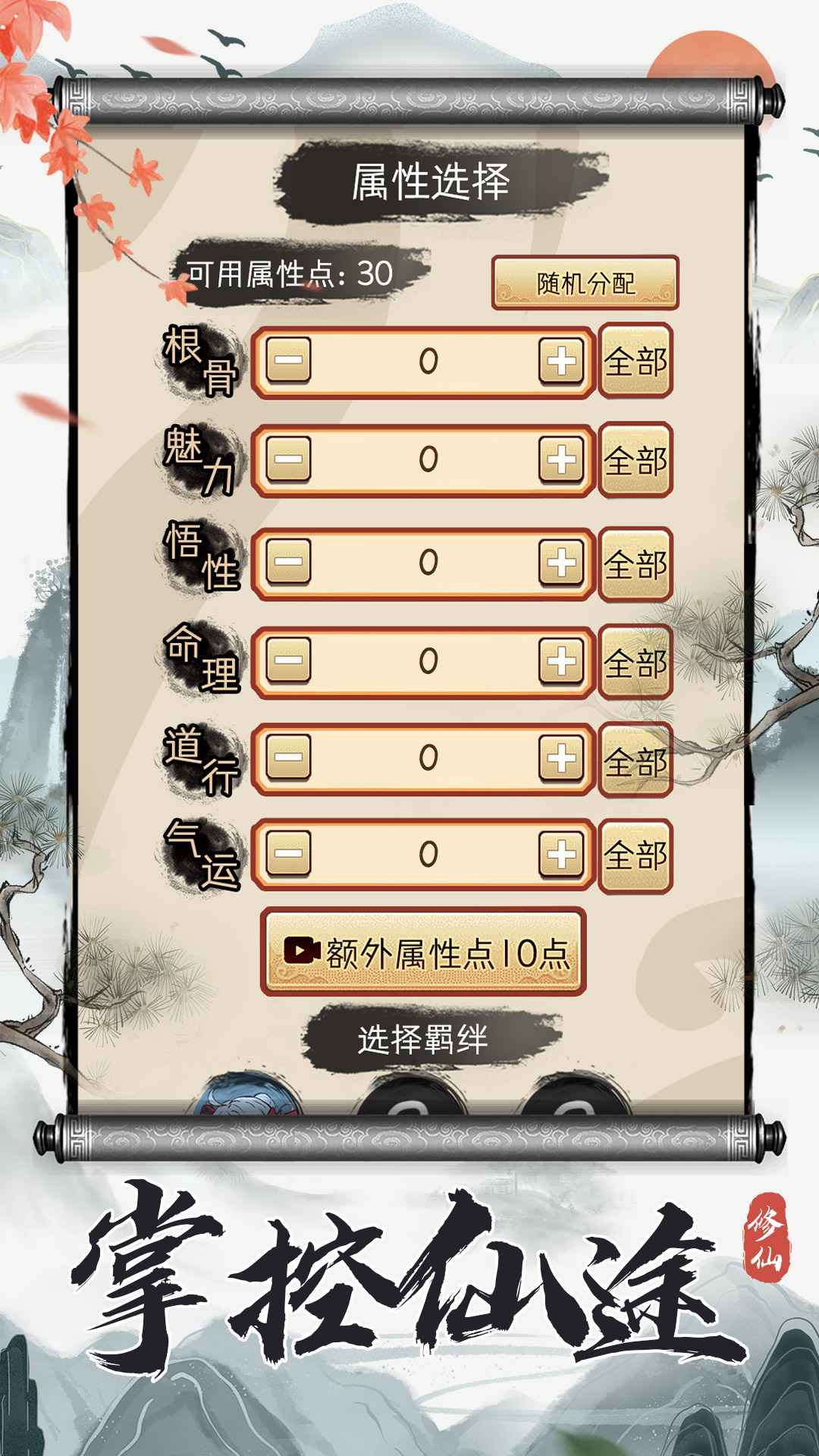 自由选择出身,体验不同的开局,可以是商人世家有金钱支援,亦可以是平民的地狱开局。还有属性点、道心值和天赋,供玩家分配。