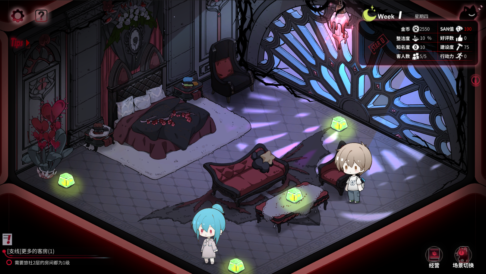 在这片龙/精灵/人共存的大地上,你继承了一座荒废已久的别墅并欠下黑暗的债务。你需要招募包括死神、龙族、斩灵师、人造人在内的员工,为不同种族提供旅社服务,也可以用屠杀和强制入梦来快速聚敛资金。另外,员工都是可攻略对象。
