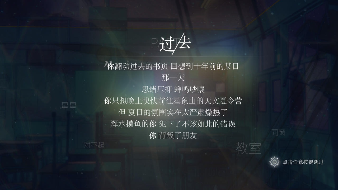 在未来世界的【万能愿望实现公司】,有着这样一个工作室——“时间信坊”。“信坊”会帮助“委托者”进入过去的记忆,送出未能送出的信。我们的主角便要作为委托人,为过去的自己传递一个信念。游戏的核心玩法为玩家扮演纸飞机,控制飞行方向并不断寻找动力源维持飞行抵达终点。在这个游戏过程中,玩家可以沉浸体验到传递信息的情感。 玩家需要体验“过去”“拯救”“归忆”三个关卡,穿梭在“星空教室”“郊野山谷”“意识空间”三个场景,感受过去自我的心理路程,并逐渐改变自己的心态,实现为自己传递信念的目的。