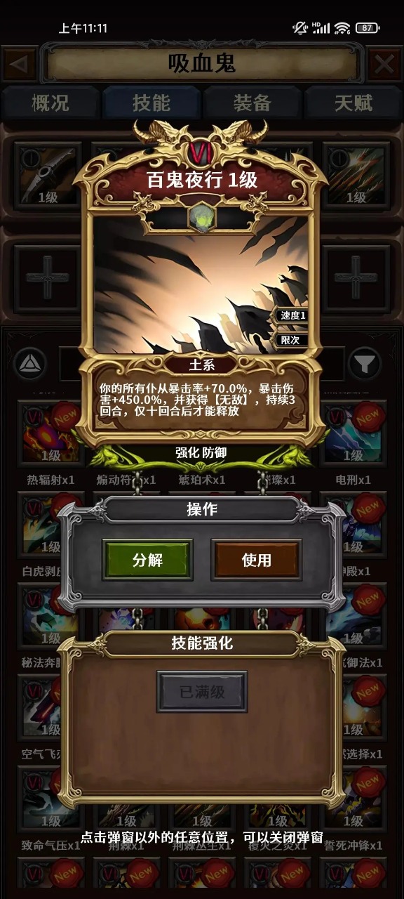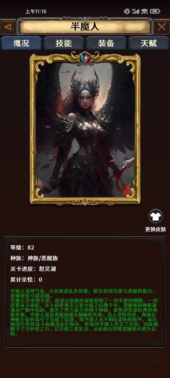 -这是一个内容丰富的角色扮演游戏,保留传统RPG乐趣的同时,也加入了大量策略构筑和轻松挂机元素,以装备搭配、技能构筑、天赋加点为主要玩法,加入了半挂机的战斗和高自由度的建造挂机系统。游戏借鉴和保留了暗黑类游戏的精髓玩法,比如随机属性的装备、收集橙装和套装、研究流派build、随机变态词条的精英怪物等等,这些才是一个RPG游戏该有的样子,而不是现在千篇一律的无脑升级RPG手游。-游戏中的流派构筑来自英雄天赋树、装备、技能这三部分,天赋通过提高英雄等级获得,总数有上限,你无法把所有天赋都加满;装备有5种品质,产生的属性和加成效果完全随机,传说装备和套装带有非常强力的技能,但它们很难获得,游戏中有超过一百种效果各异的传说装备和套装;技能是英雄的基础输出组件,你可以从近200种技能中选择10种进入关卡战斗(注意不同种族使用的技能派系有所限制)。-游戏的地图共有5大关,每关又分为15小关,共有超过200种怪物,每种怪物都有自己独特的技能杀招,精英和boss怪物还有随机生成的特殊能力。在你通关了所有关卡后,可以进入更高难度的关卡挑战,难度越高,掉落的装备质量越高,传说和套装的爆率也越高。-在你通过关卡后,可以在本关选择一种建筑建造,建筑能够让你以离线挂机的方式持续生产金币、装备、技能、材料等所有资源,对建筑种类等级的合理分配将会深刻影响你的养成进度,光靠挂机收菜也能成为大佬!-我们将会在游戏上线后继续更新更多游戏内容,例如新英雄、新技能、新的传说装备和套装、新的关卡副本,也会考虑推出PVP模式或者肉鸽模式等新鲜体验,只要大家觉得好玩,我们就会爆肝完善这款游戏,感谢支持!游戏背景故事:这里是未来的元素大陆,入侵事件已经过去了一万年,一切重归混乱,生物都发生了剧变,大陆被新诞生的种族势力重新瓜分。首先,元素精华被消耗殆尽,重回四类原始元素:气、火、水、土,伤害类型变为物理/气系/火系/水系/土系/混乱。魔力被记录到了技能卷轴上,只要携带卷轴就能使用对应技能,但大多数技能都对使用者有种族的限制。其次,生物演化成了五个阵营。不死族-来自于部分带有魔力的原始生物以及已死的入侵者(人类),势力的战力最低,形同一盘散沙恶魔族-来自于大陆上古魔物后裔,当前最强大的势力,屠戮其他阵营,性格霸道残暴;神族-来自于大陆上古魔物后裔假装为神,与恶魔族结盟自保,它们是最神秘的种族(神族目前还从未出现过破坏神),表面上它们屈从于恶魔族助纣为虐,实际上可能暗中已经完成了对恶魔族的幕后操控;机械族-来自于曾被入侵者永久附魔的物体,势力范围最少,高智力,热爱和平,性格敏感而懦弱,是最不可能征服元素大陆的势力人族-来自于大陆原始生物及入侵者后裔,长期抵御恶魔族的入侵,永不妥协,但人族帝国的腐朽已久,谁也无法拯救将倾的帝国再次,整个大陆被信仰所占据,出现四大教派,分别是魔界、灵界、天界和机械教派,信仰者们分别视地狱神、鬼魂、天堂和机械飞升为唯一真理,整座大陆没有信仰真空之处,除了破坏神。破坏神是被选中的个体,破坏神可能来自任何一个种族,可能在任何时刻觉醒,据说觉醒为破坏神之人都有一个共同点,就是放弃了所有信仰。破坏神不受元素大陆魔力的限制,可以无限成长,创造奇迹,与其说他们会是元素大陆的救世主,不如说是毁灭者。破坏神第一步要做的事,就是横扫所有种族,占领整片大陆。