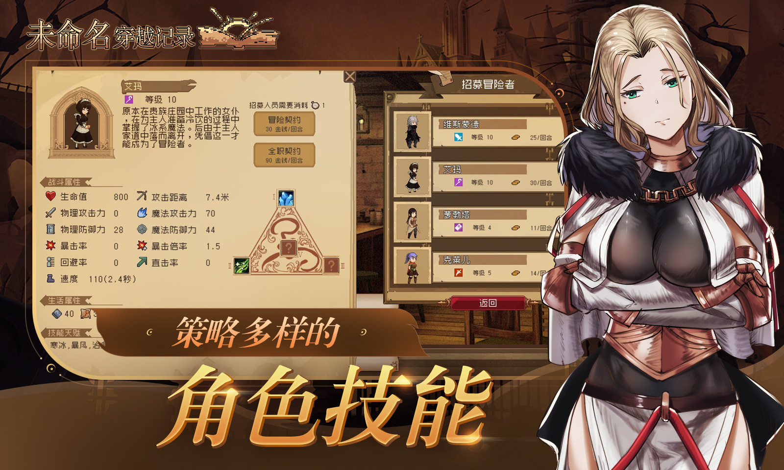 《未命名穿越记录》一款异世界题材的团队养成策略游戏,讲述一名小说家意外穿越到自己的作品中,在与自己创作的背景似是而非的世界里建立自己的公会、探险并获得足以影响世界的力量、揭露时空扭曲的真相并寻找同样迷失在异世界中的青梅竹马的故事。丰富且充满分支的剧本,你所决定的不仅是剧情,更有无法预料的暗中影响;精细多彩的角色特性以及不同的技能组合,从同伴与敌人身上学习魔法与技能知识纳为己用。通过日常工作、工会建设以及团队决策、地城探索等内容在城内站稳脚跟;多样的随机性系统,每一次挑战都有不同的发现与体验;近十个不同的结局,只有了解一切方能得知故事的真相。