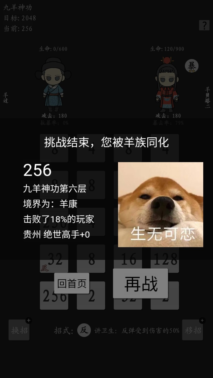 羊过,羊铁心,羊不悔,王重羊…史上最难“羊”来袭,速速修炼九羊神功,顶住“羊姓”侵袭。你的目标:练成九羊神功(4096)不管多难,请别放弃防护,治疗;不管多大,要相信童话,英雄,和魔法!注意:及时提升神功等级,它能提升你的血量和伤害,合理运用魔法,用策略击败敌人。打疫苗:被暴击概率降低20%戴口罩:闪避对方下一次伤害;多锻炼:该回合攻击暴击;早就医:回复当前血量的20%;勤通风:吸取造成伤害的50%,勤洗手:使对方损失当前气血的30%;不聚集:使对方眩晕一回合,无法攻击;讲卫生:反弹受到伤害的50%;保距离:魅惑对方一回合,不分敌我进行攻击