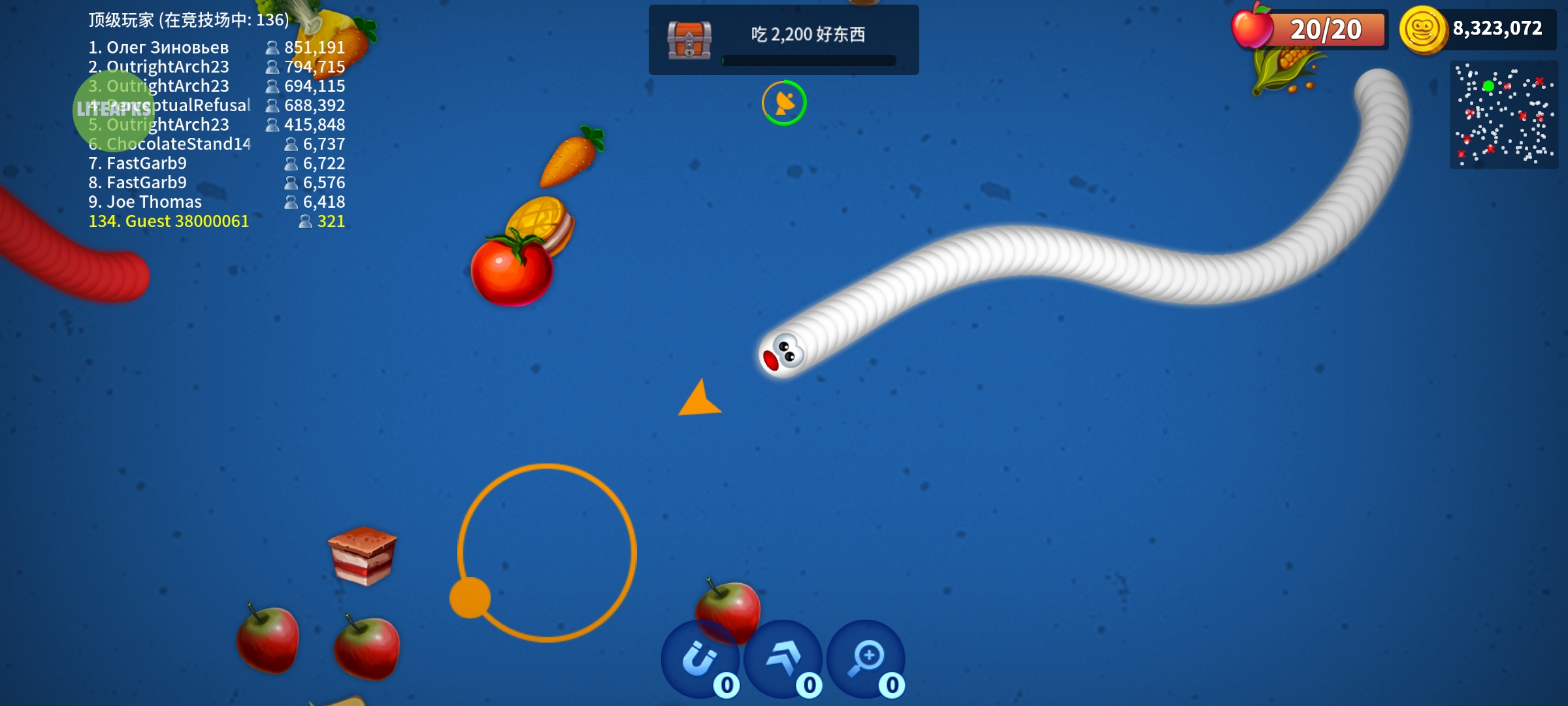 在蠕虫区中,欢快,蓬松的贪吃蛇在广阔的舞台上竞争。