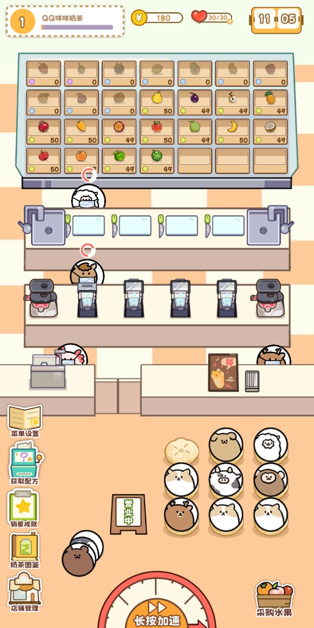 什么?水果原材料哪里来?哦对对对,瞧我这脑子,都忘了说了。我们QQ咩咩奶茶店为了保证奶茶的风味,用的都是最新鲜的水果,老板你得定期去采购水果,根据菜单选择想要的水果种类,玩一玩简单有趣的三消小游戏,就能够把最新鲜的水果带回家啦!