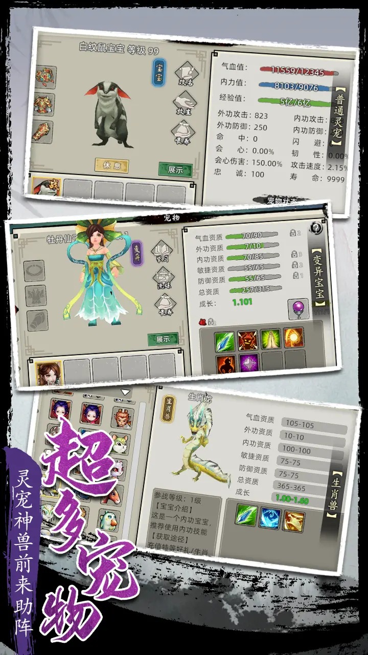 游戏宠物共分五个等级,分别是宝宝,变异宝宝,灵兽,生肖兽,神兽五大宝宝,总计90多种不同类型宝宝,灵兽以上宠物拥有至少2个专属技能